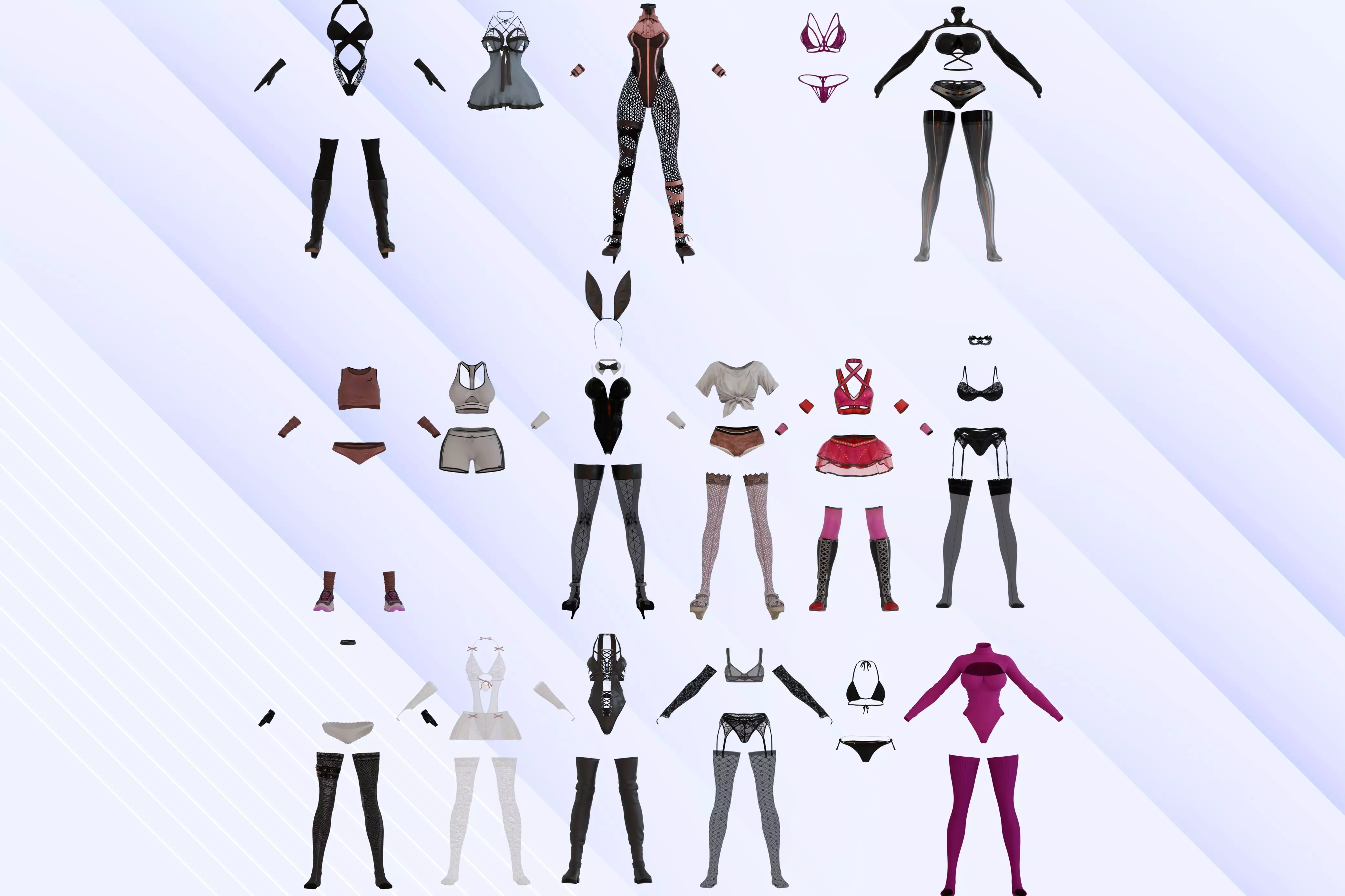 Modular pieces (tops, bottoms, bodysuits, stockings, boots, accessories)