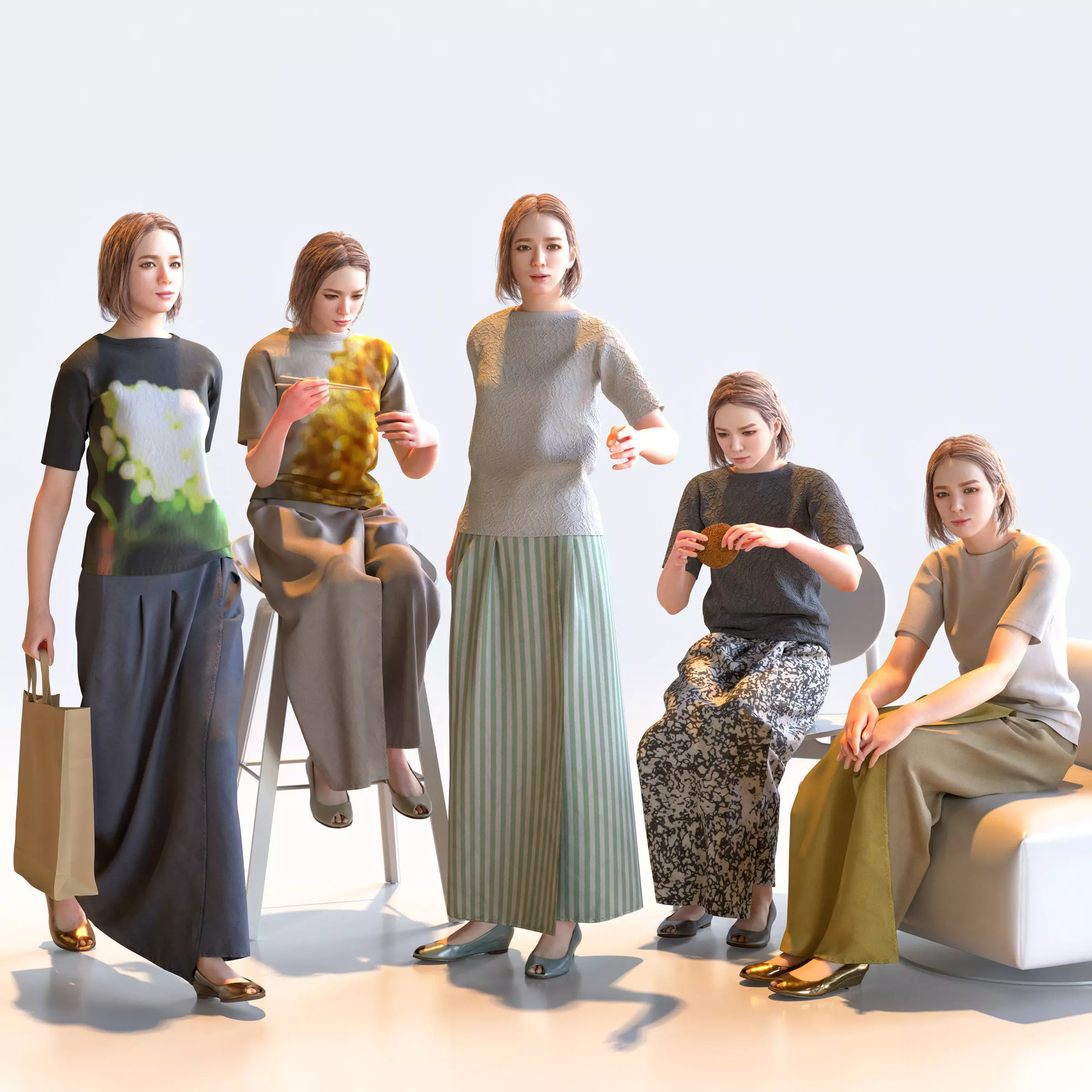 Set of 5 Posed Asian Casual Woman 3D models for architectural visualization scenes and CG projects.