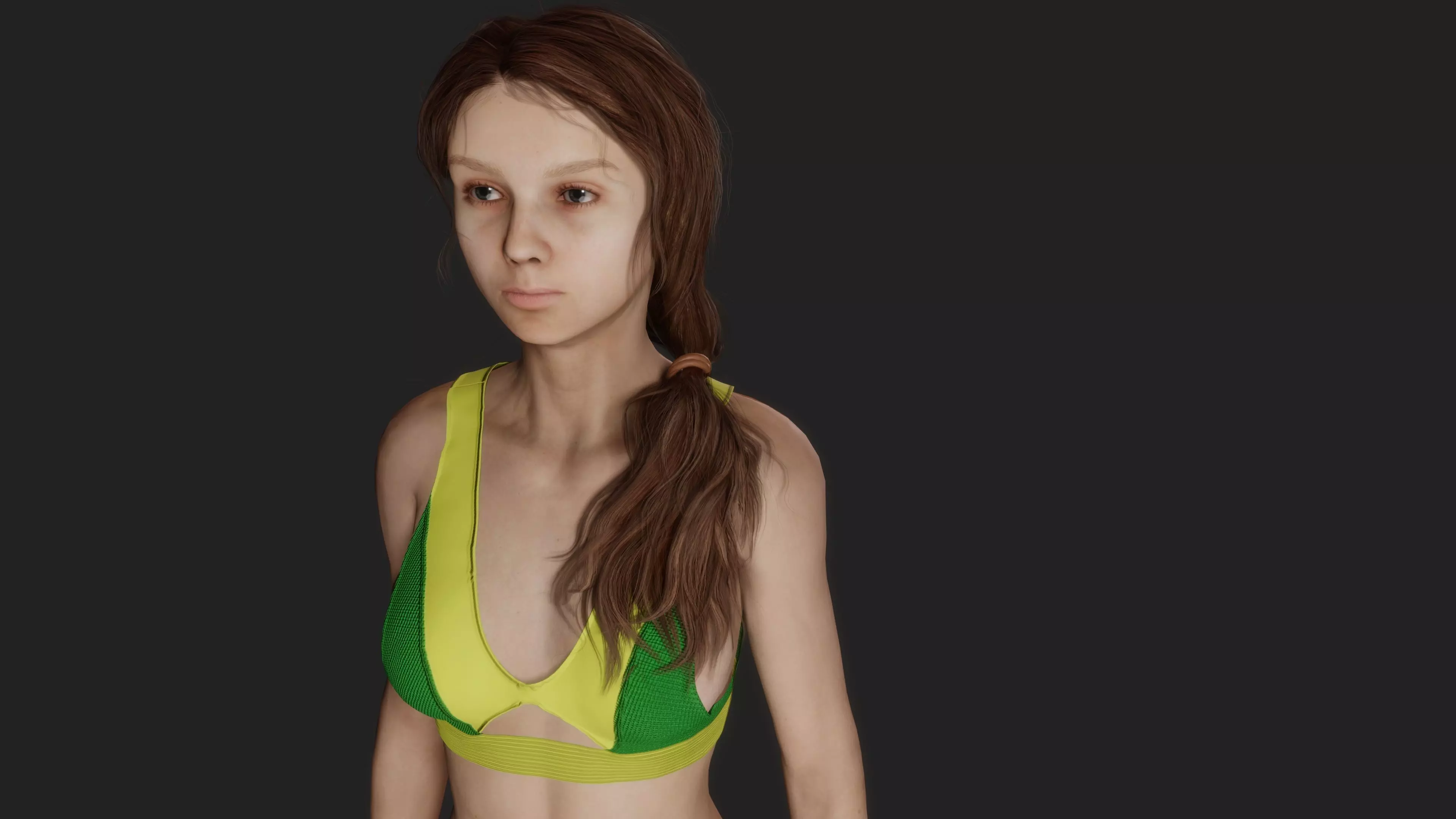 Completing the ensemble, the model sports light green beach slippers that add a playful yet grounded touch to her beach-ready look. Every aspect, from the arch of her eyebrows to the details in her nails, has been meticulously sculpted and textured to achieve a level of realism that is truly captivating.