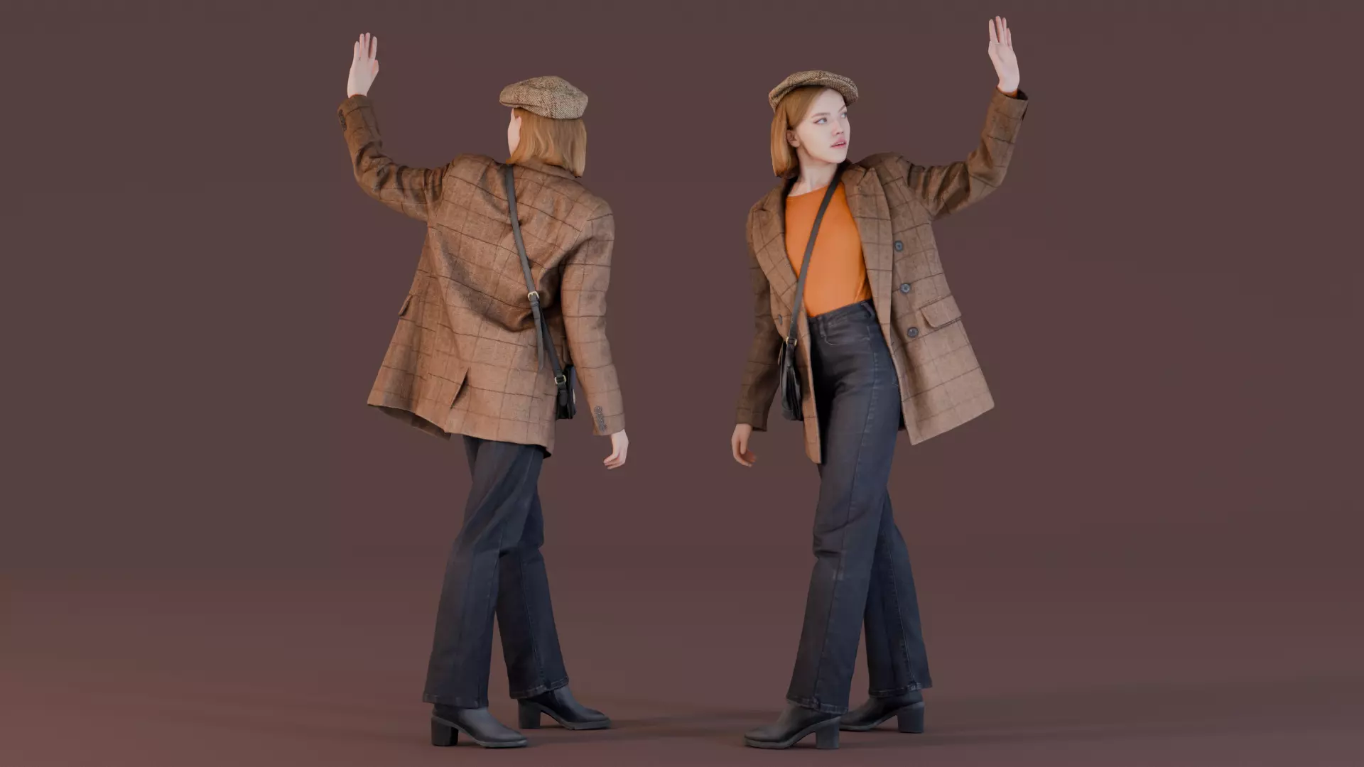 This stylish 3D model features a fashionable young woman dressed in a retro-inspired plaid jacket, paired with a flat cap and flared jeans. She is mid-gesture, waving her hand as if hailing a cab or saying goodbye, embodying a modern twist on vintage street style. Her sleek black boots and casual shoulder bag complement the overall look, making this model perfect for urban scenes, fashion showcases, or period-inspired settings.