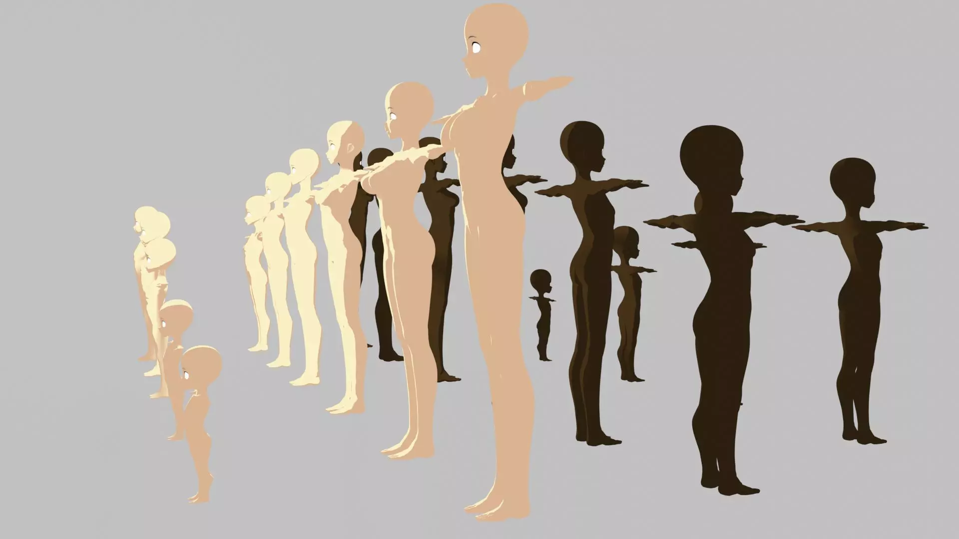 Presenting the Base Meshes Black and White Female Characters Rigged Pack, a comprehensive collection of 3D models that includes both black and white female characters at every stage of life, from infancy to adulthood. This pack is perfect for game development, animation, and 3D projects that require a diverse range of high-quality, stylized characters with a manga-inspired aesthetic that responds dynamically to light.