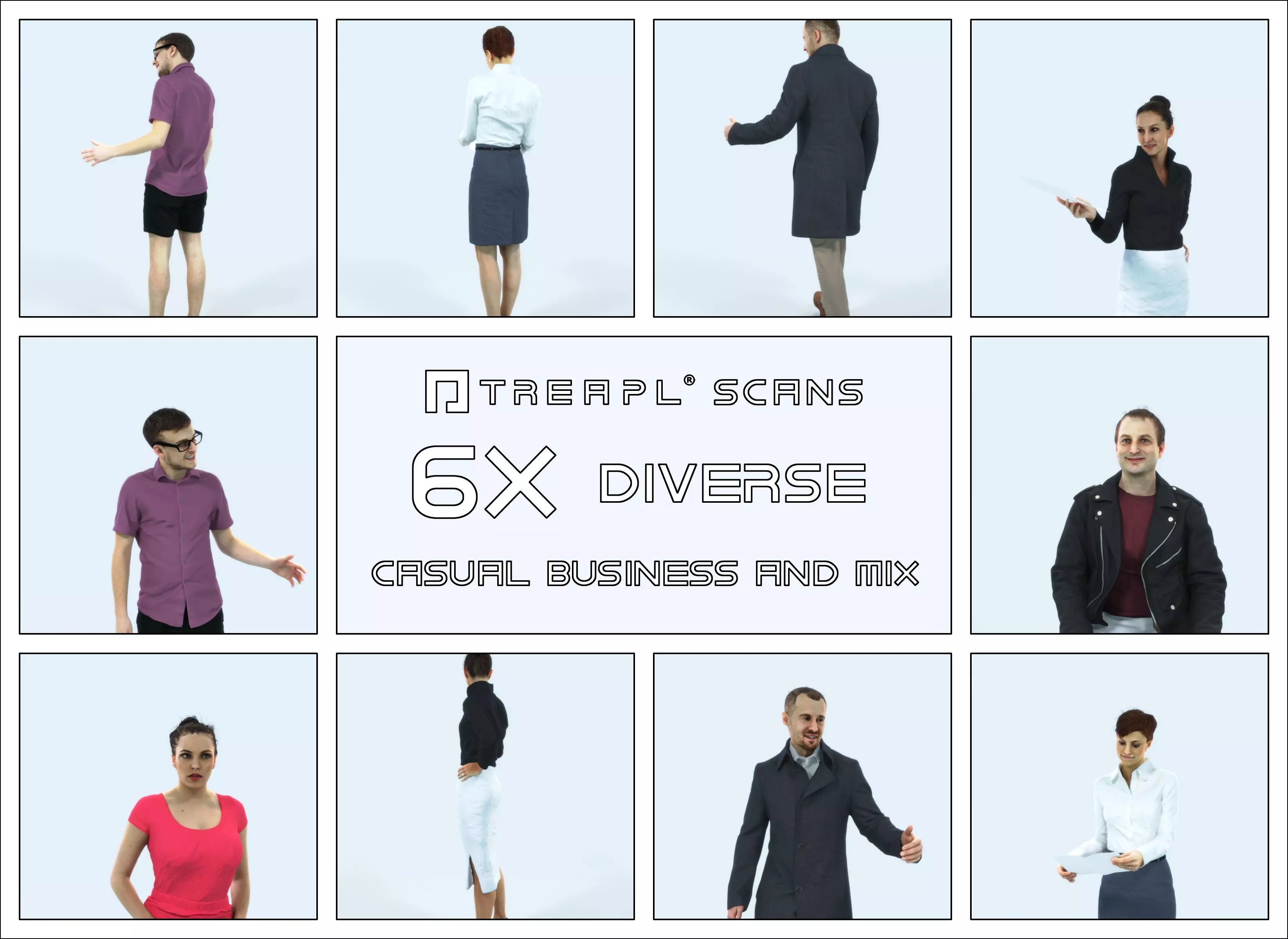 Treapl characters are premium quality scanned 3d people for high-end architecture and advertising - we love presenting both - attractive professional models as well as casual everyday people.