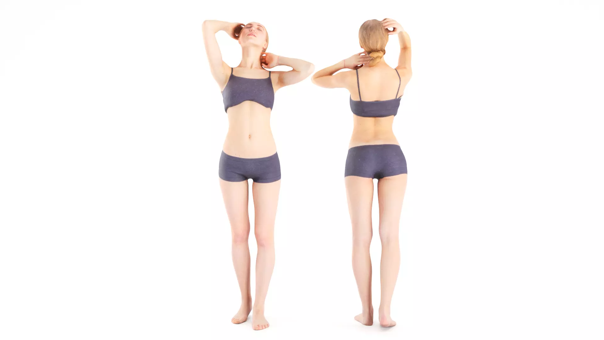 This is a true human size and detailed model of a sporty beautiful young woman of Caucasian appearance. The model is captured in casual pose to be perfectly matching for variety of architectural visualizations, e.g. sport ground, gym, beach, etc.