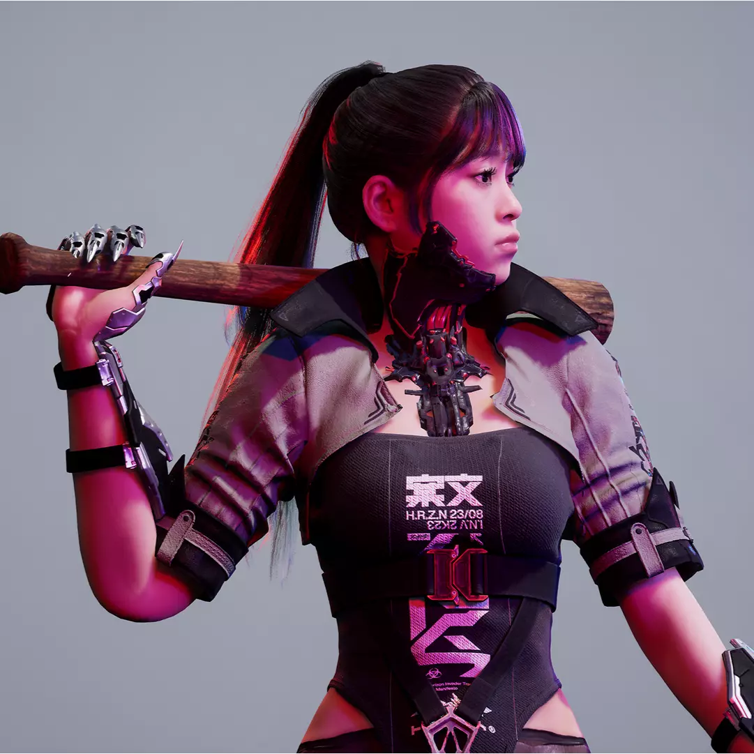 A High quality Scifi Character suitable for fighting games or scifi based projects with a realistic outfit with detailed accessories a full facial rig compatible with apple blendshapes and customizable hair and eye materials as well as multiple texture variants, optional neck Cyberware, hidable sections using materials for easy integration and a baseball bat and revolver preintegrated to sockets