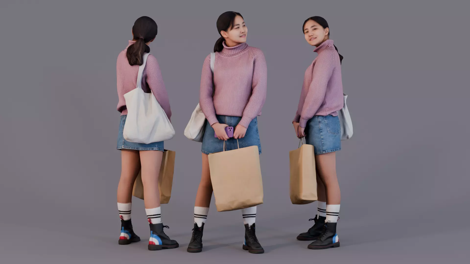 Tags: casual, shopping, turtleneck, denim skirt, boots, streetwear, urban, 3D model, VR, AR, real-time, photorealistic, background character, lifestyle, female model, fashion, city life