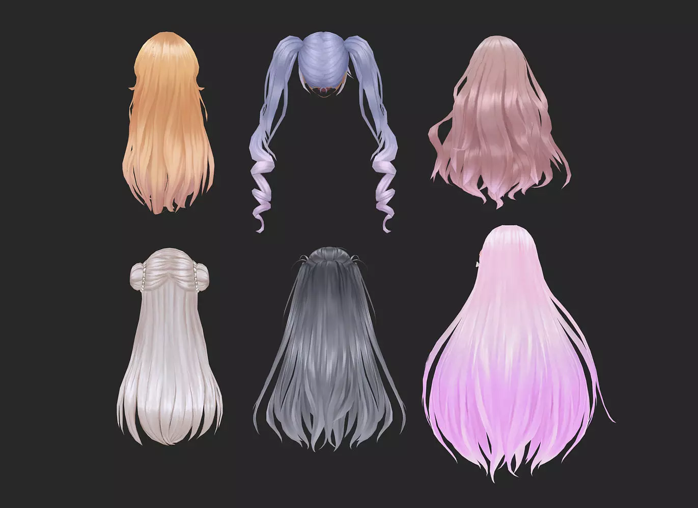 1. The scene includes 6 different hair style models and 6 same low-poly head models.