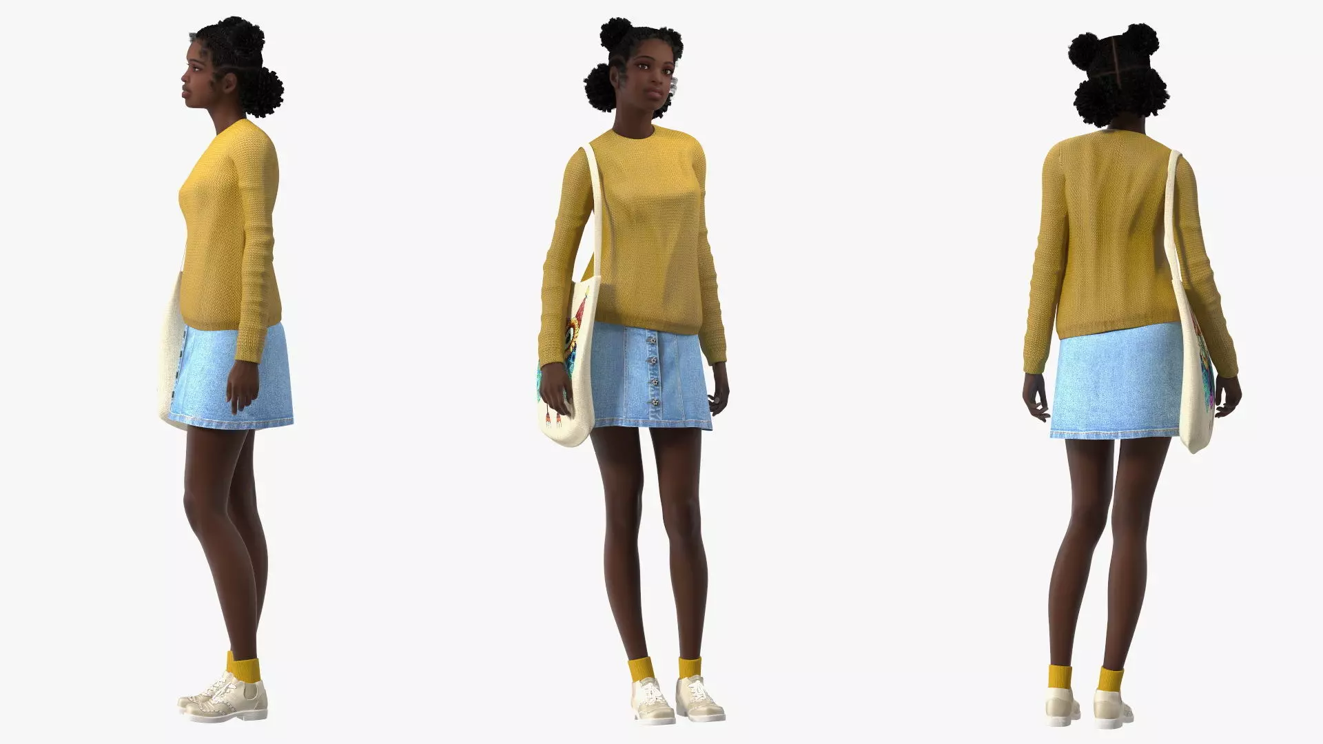 Brave modern teen girl person with popular street style fashion clothing or garment.Popular casual urban style (streetwear, or street wear) female outfit a clothing set with sweater, skirt, socks, shoes and bag.An African American, Afro-American, African-American, Aframerican, Afro American, or Black elegant, brave, clever, woman teenage person.For teenage girl fashion, modern style teenage clothes, modern female hair fashion, junior female fashion styles, women clothing styles, young women casual street clothing, contemporary adolescent women fashion, contemporary teenager hair styles, fashionable teen girl models, and modern teenage footwear marketing, educational, advertising, documentary, or promotional projects.