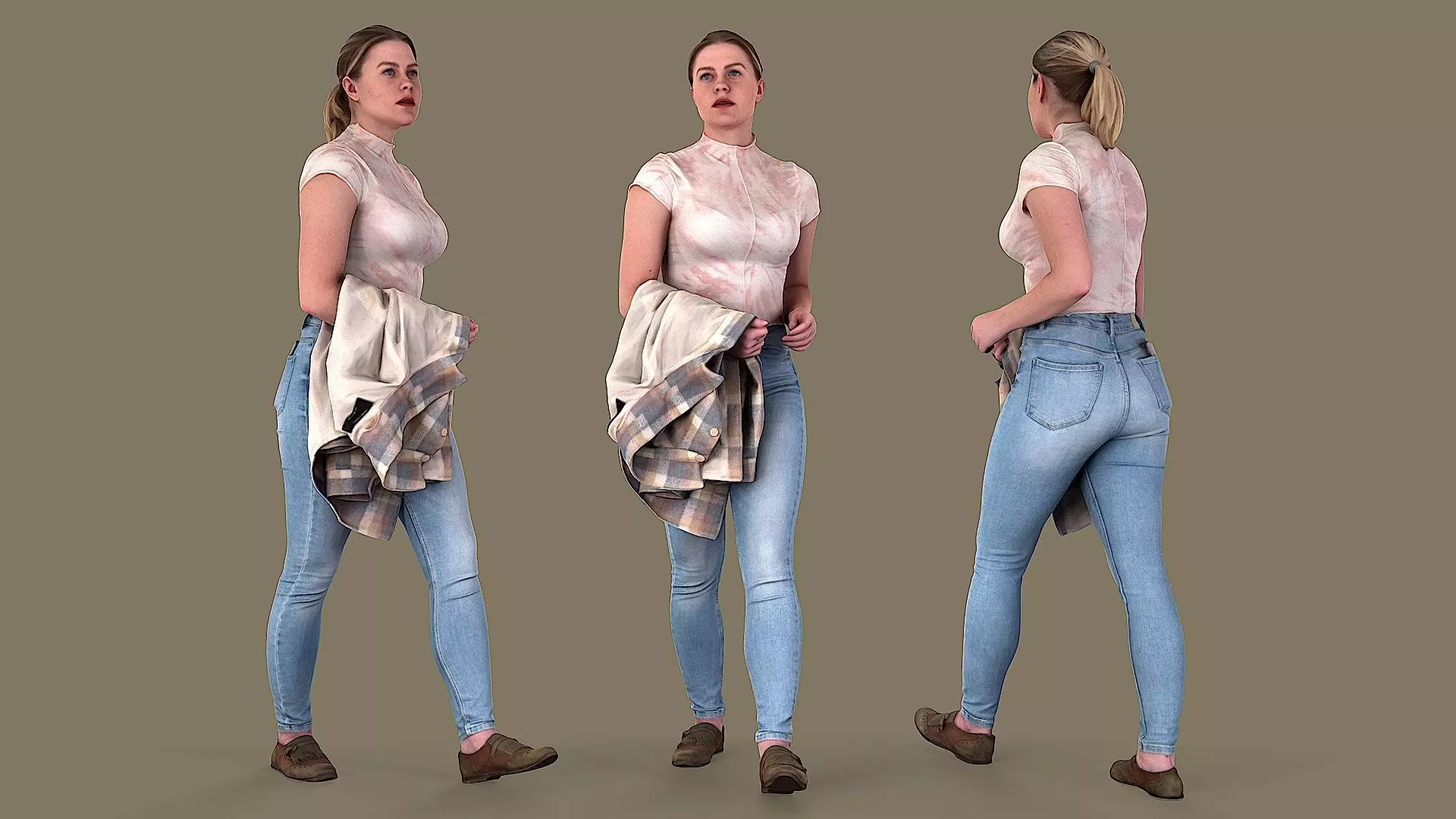 A young woman caught in the middle of a stride. She is stylishly casual, dressed in figure-hugging light blue skinny jeans and a form-fitting t-shirt that looks more like a body suit due to its snug fit and high neckline. It's a soft pink with a tie-dye pattern. A checkered shirt is casually draped over her arm, a playful nod to the grunge era. A smartphone peeks out from her back pocket, hinting at her digital connectivity. Her light hair is neatly tied up in a ponytail, keeping it off her face and allowing a clear view of her youthful features.