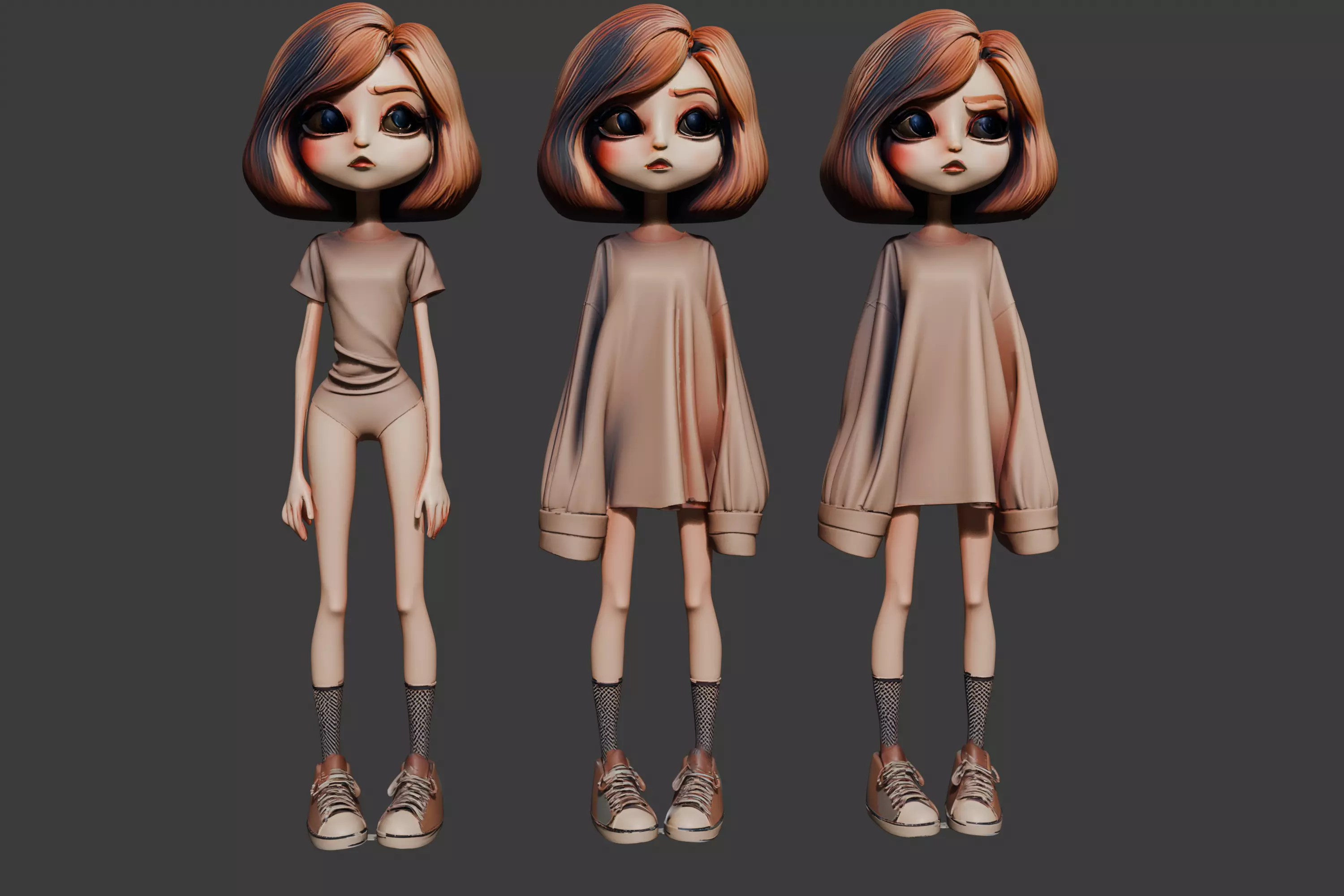 This charming stylized 3D character features a whimsical, big-eyed cartoon girl with three interchangeable outfits, perfect for animation, games, or storytelling projects. Her expressive face, detailed hair texture, and versatile clothing options make her ideal for indie game developers, animators, and digital artists seeking a unique protagonist or NPC.