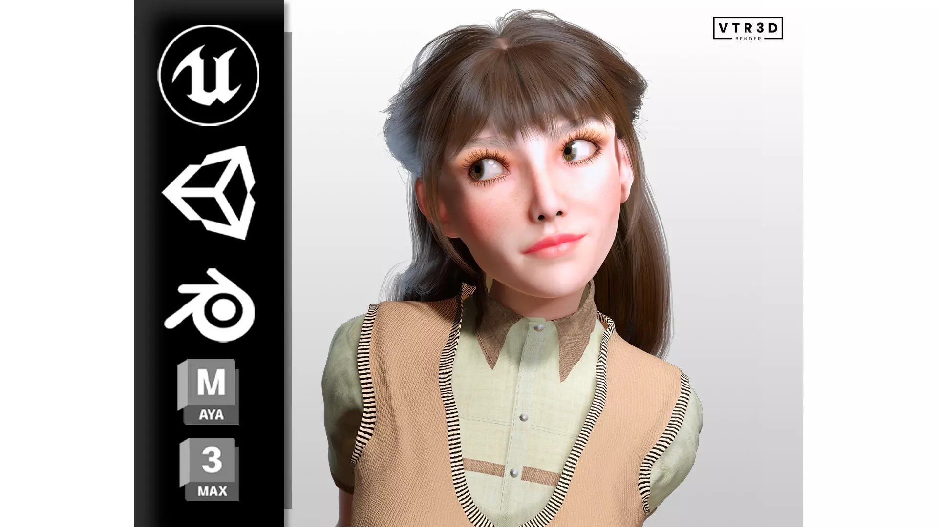 This stylized young female character combines soft, appealing proportions with realistic surface detail, making it ideal for modern games and cinematic productions. The model features expressive eyes, subtle blush tones, natural skin shading, and carefully crafted facial anatomy that enhances personality and charm while maintaining a believable look.