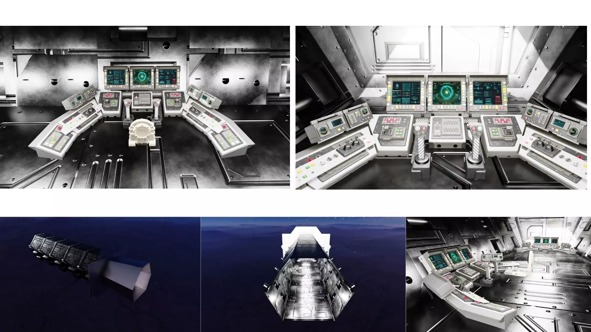 Designed with a clean modular layout and high-quality details, this futuristic control room features multiple console stations, sci-fi panels, monitors, and a metallic aesthetic suited for any spaceship or space station interior.