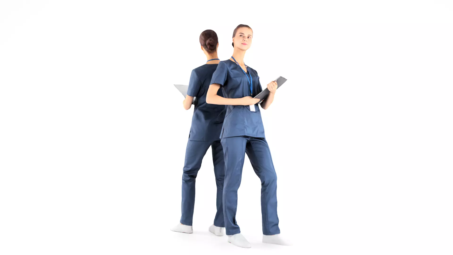 This is a true human size and detailed model of a beautiful young woman of Caucasian appearance dressed in a uniform of a surgical nurse. The model is captured in casual pose to be perfectly matching to variety of architectural visualizations, e.g. advert banners, professional products/devices presentations, etc.