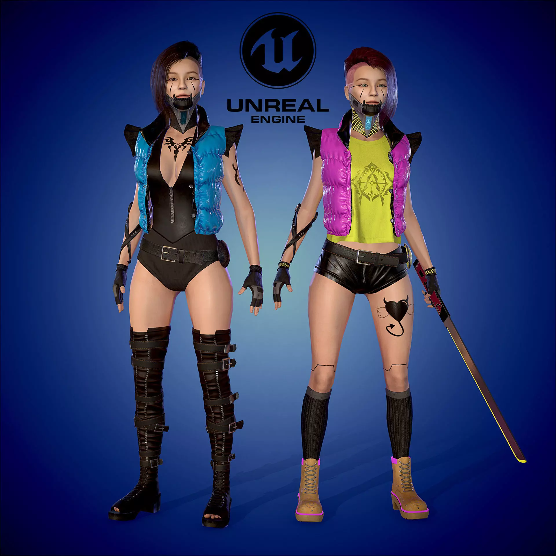 Low-poly 3D model Game ready: Sweet Devil. Rigged humanoid skeleton 4 Hand and Foot IK. UNREAL projects include! 3d model, rigged, ready for games and other applications in real-time. Model creaed in Zbrush, rigging in maya. Textures Substance painter, PBR textures(Diffuse,Metallic,Roughness,Normal) 2k. The project has two skin and blade. Skin_1 - 25,700 faces, Skin_2 - 23,070, Blade 292 faces. Skins have such materials: head, body, cornea, eye, hair, scalp hair, jaw_tech, hand_tech, clothing, jucket, boots, gloves, upper and lower teeth.