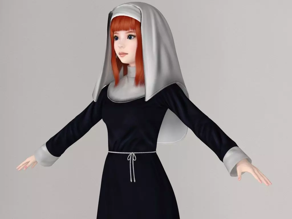 T-pose nonrigged model of Western girl Olivia in nun outfit. Model is turbosmoothed to give a high quality render.