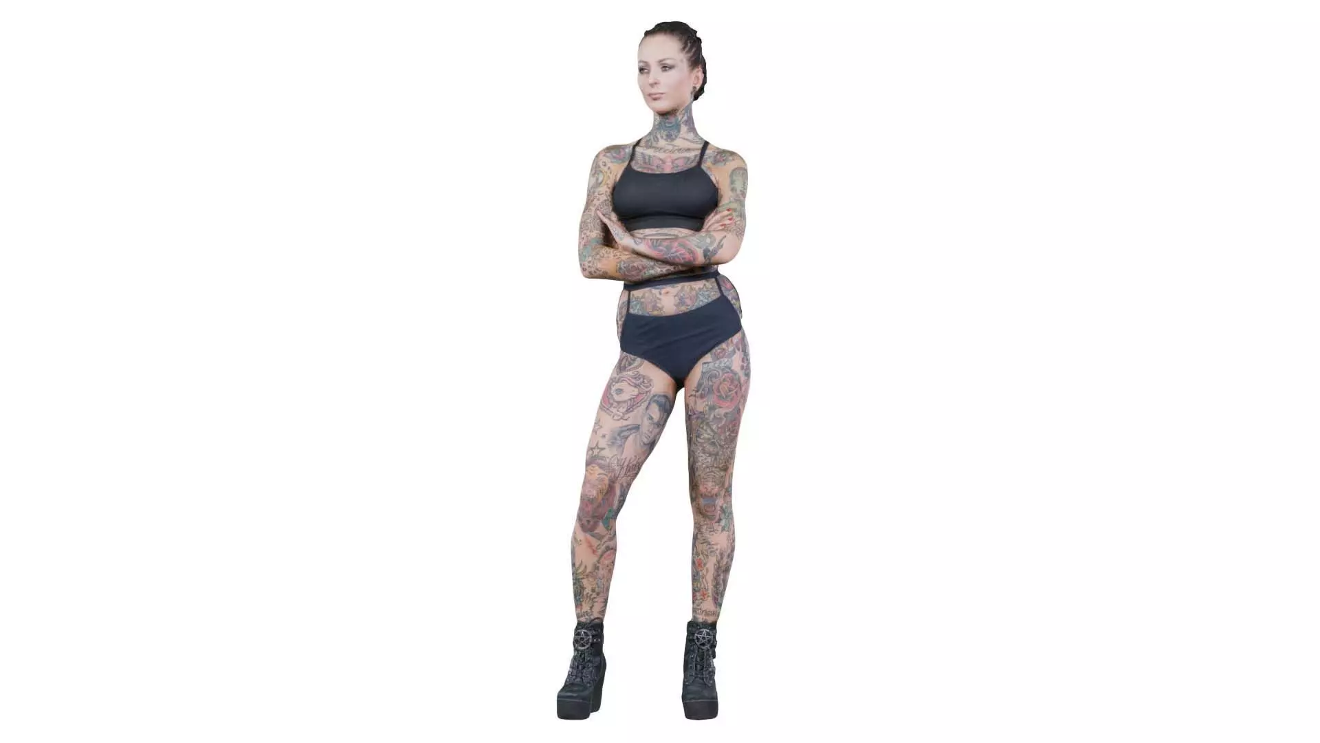 Polygonal Miniatures presents tattoo model 7, a model from our 3D scanned catalogue. The model, a woman with tattoos standing with her arms crossed, is obtained by photogrammetry, and scanned using SLR camera's.Processing takes place in Zbrush and Photoshop and the resulting 3D model has unwrapped, non overlapping UV's, and a texture and normal map. Before publishing, we make sure the model has real world scale (meters), correct shader setup and is centered at the origin.Apart from the various file formats, we also offer a Blender file with material and textures set-up, ready for export and rendering. More info can be found below: