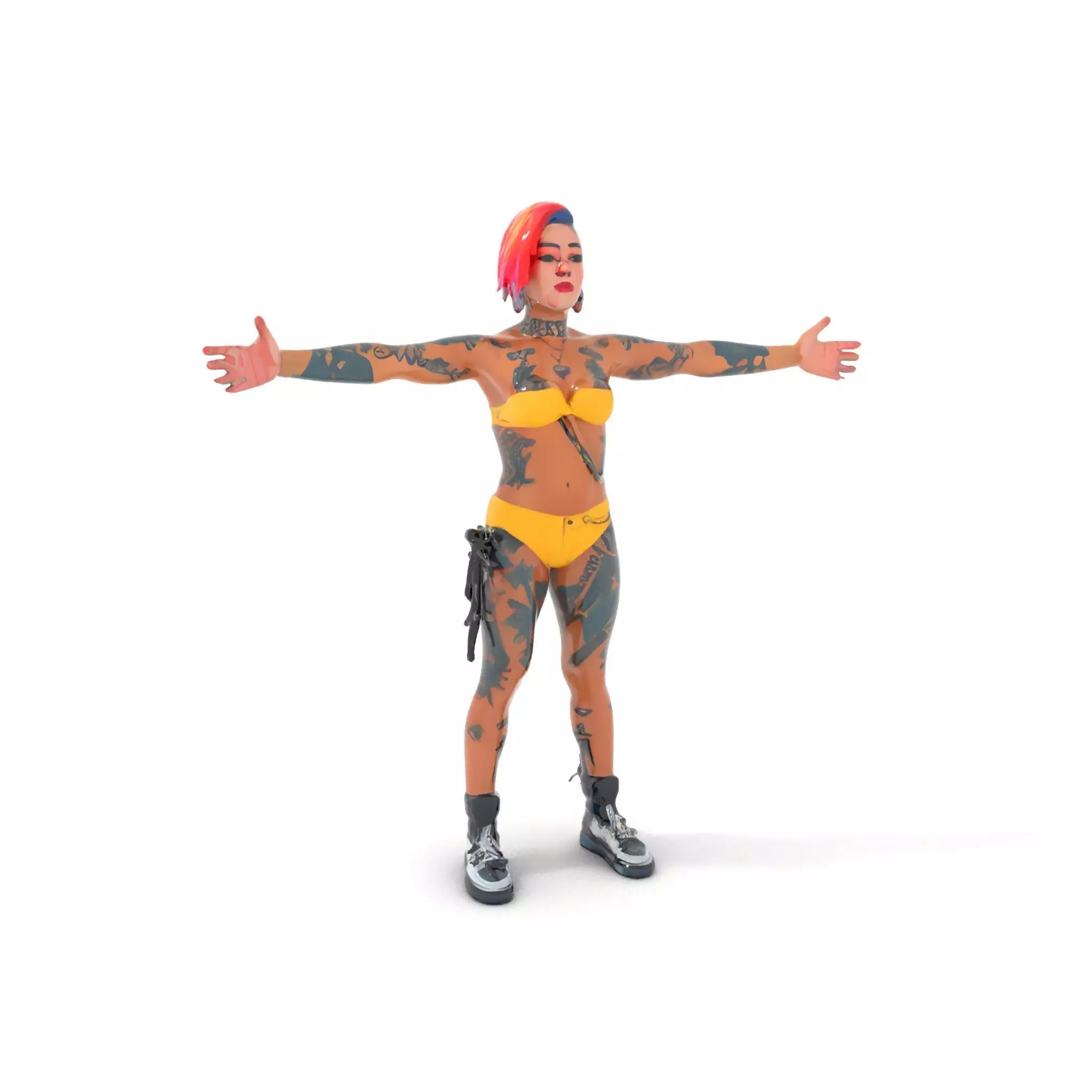 This vibrant bikini character model is designed with a striking blend of colors and unique tattoo art, capturing an edgy and modern aesthetic. The model is available in three levels of detail, suitable for various applications from mobile games to high-quality rendering projects. Each level, carefully crafted, offers flexibility for any interactive display or digital presentation. The model textures are meticulously crafted with PBR materials, utilizing Diffuse, NormalMap, and reflection/roughness/metallic textures, making it compatible with all contemporary rendering engines. All textures are 4096*4096, ensuring high fidelity and quality. Models include three LOD systems: low-poly for 1000 triangles for mobile, middle-poly with 10,000 triangles for environments, and high-poly with 100,000 triangles for productions. All models are accurately unwrapped with no overlapping UVs, enhancing versatility for game engines like Unity and Unreal. Perfect for animation, game development, and interactive design projects. Like and comment if you appreciate this model and want more vibrant, detailed designs.