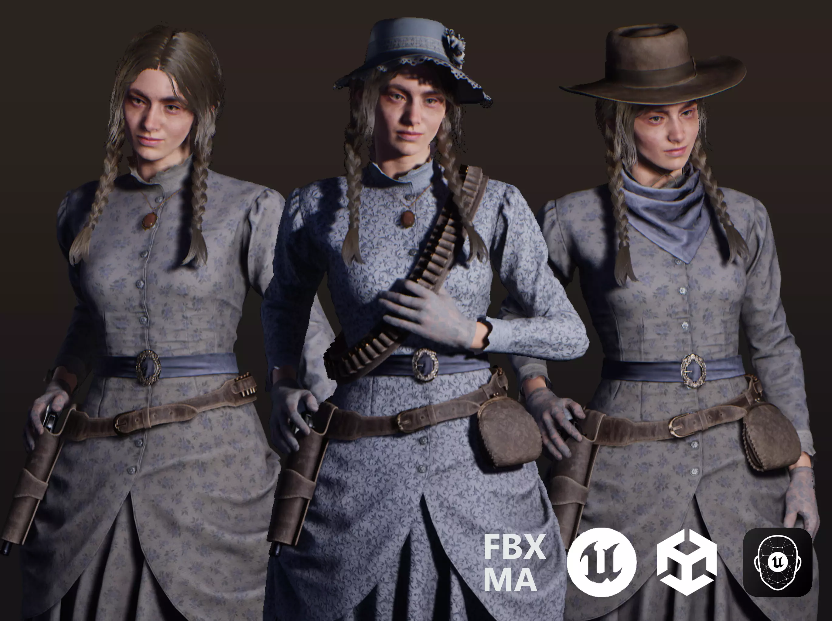 - Appearance: A light, draped city dress, a neat belt and bag, a bandolier over her shoulder, a hat, and a scarf around her neck—she looks ladylike, but her gear makes it clear she's used to the road and gunfights.