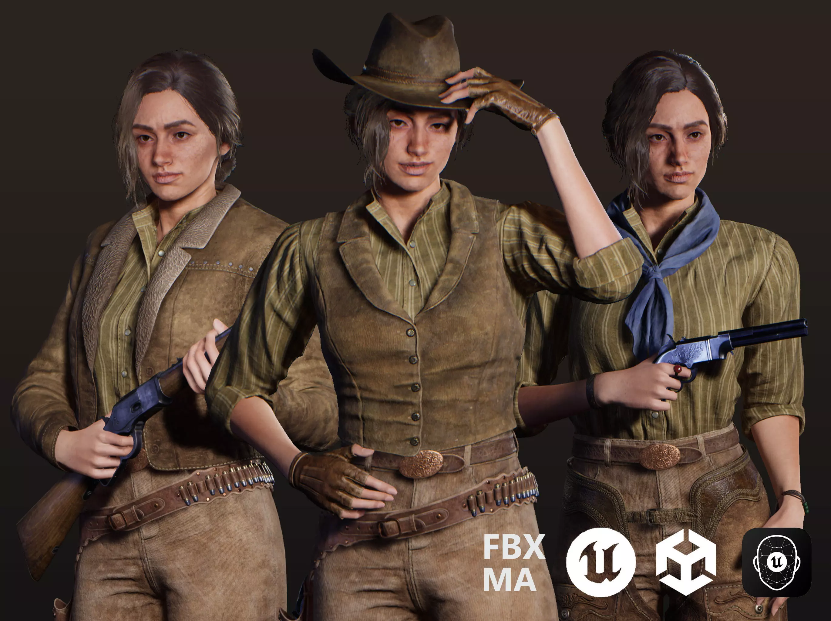 Appearance: Agile and bold rider in light gear. Fast as the wind and deadly with a revolver. Modular outfit: jacket, vest, shirt.Personality: Clever, resourceful, with a sense of humor and an iron will.Goal: To find her missing brother, who vanished amid mysterious events in the desert.