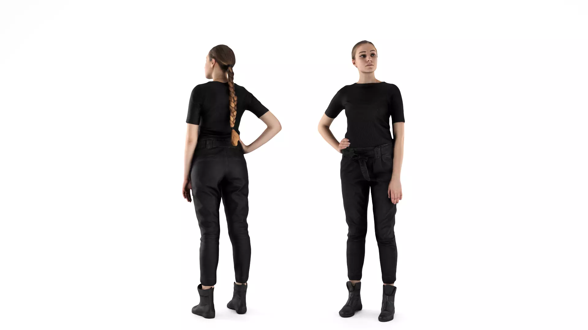 This is a true human size and detailed model of a sporty beautiful young woman of Caucasian appearance dressed in casual style. The model is captured in casual pose to be perfectly matching for variety of architectural visualizations, e.g. urban installations, city designs, outdoor design presentations etc.