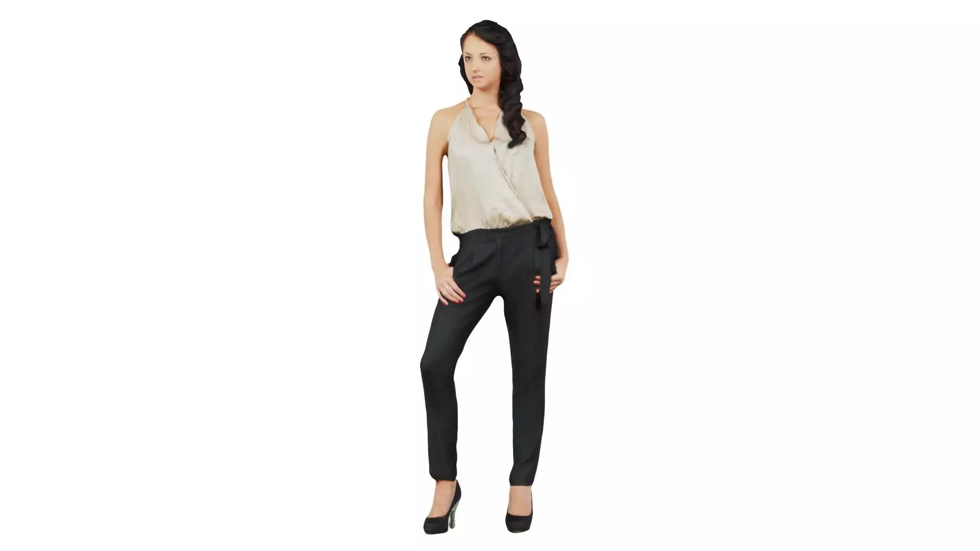 Polygonal Miniatures presents woman in black pants and golden top, a model from our 3D scanned catalogue. The model, a woman in black pants and a top, is obtained by photogrammetry, and scanned using SLR camera's.Processing takes place in Zbrush and Photoshop and the resulting 3D model has unwrapped, non overlapping UV's, and a texture and normal map. Before publishing, we make sure the model has real world scale (meters), correct shader setup and is centered at the origin.Apart from the various file formats, we also offer a Blender file with material and textures set-up, ready for export and rendering. More info can be found below: