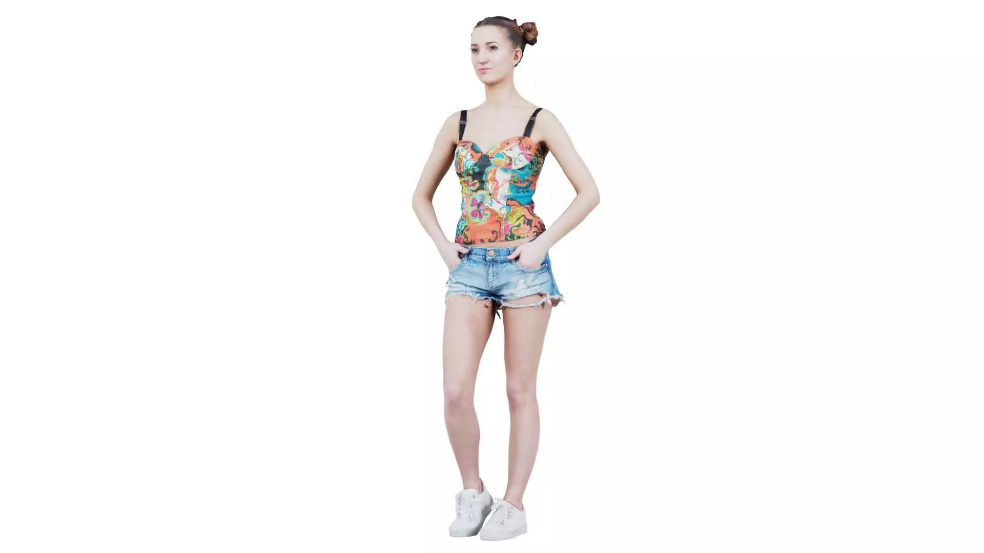 Polygonal Miniatures presents woman in flower top sneakers and jeans posing 2, a model from our 3D scanned catalogue. The model, a woman in shorts and a top standing, is obtained by photogrammetry, and scanned using SLR camera's.Processing takes place in Zbrush and Photoshop and the resulting 3D model has unwrapped, non overlapping UV's, and a texture and normal map. Before publishing, we make sure the model has real world scale (meters), correct shader setup and is centered at the origin.Apart from the various file formats, we also offer a Blender file with material and textures set-up, ready for export and rendering. More info can be found below: