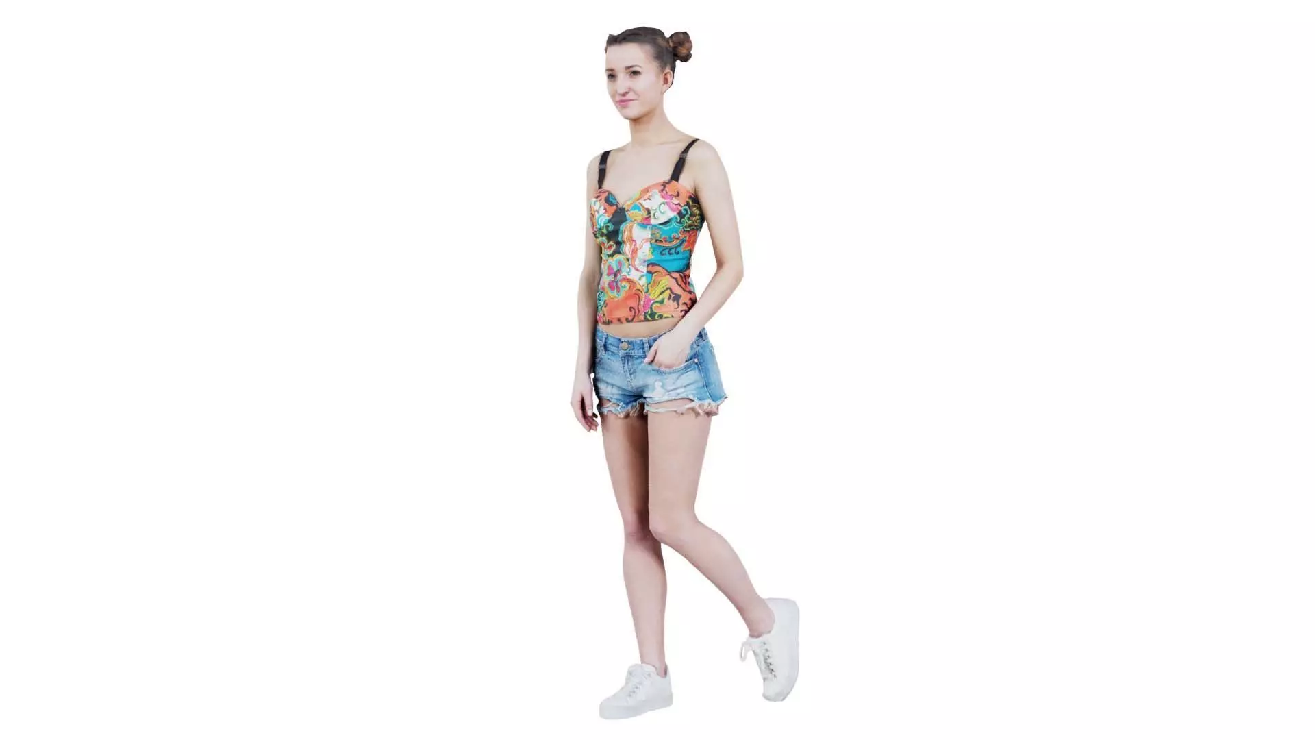 Polygonal Miniatures presents woman in flower top sneakers and jeans posing 3, a model from our 3D scanned catalogue. The model, a woman in shorts and a top standing, is obtained by photogrammetry, and scanned using SLR camera's.Processing takes place in Zbrush and Photoshop and the resulting 3D model has unwrapped, non overlapping UV's, and a texture and normal map. Before publishing, we make sure the model has real world scale (meters), correct shader setup and is centered at the origin.Apart from the various file formats, we also offer a Blender file with material and textures set-up, ready for export and rendering. More info can be found below: