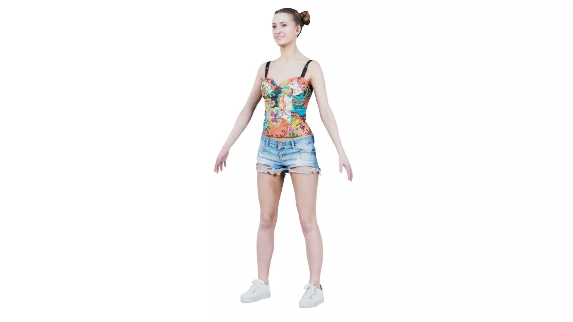 3D scanned model featuring a woman in shorts and a top standing with her arms out. This model, woman in flower top sneakers and jeans posing standard pose, has been created using photogrammetry from a real world object.The raw scan data has been cleaned, retopologized and UV-unwrapped using Zbrush. The result is a low poly mesh with baked maps. The .obj and .mtl are configured so that maps will load automatically in the shader (tested in Blender). In addition, a Blender scene is provided with the model and shader already set up for rendering and export. Detailed information below: