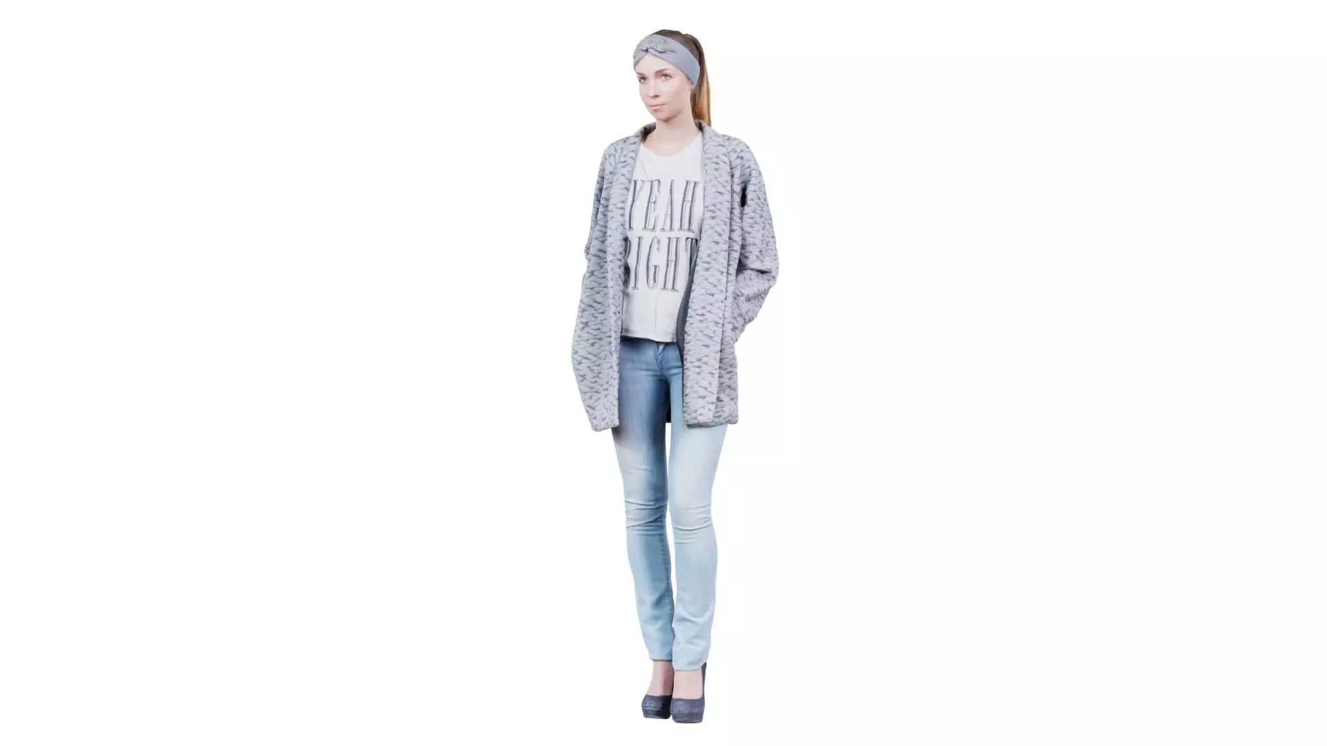 Polygonal Miniatures presents woman in jeans and cardigan, a model from our 3D scanned catalogue. The model, a woman in jeans and a sweater standing, is obtained by photogrammetry, and scanned using SLR camera's.Processing takes place in Zbrush and Photoshop and the resulting 3D model has unwrapped, non overlapping UV's, and a texture and normal map. Before publishing, we make sure the model has real world scale (meters), correct shader setup and is centered at the origin.Apart from the various file formats, we also offer a Blender file with material and textures set-up, ready for export and rendering. More info can be found below: