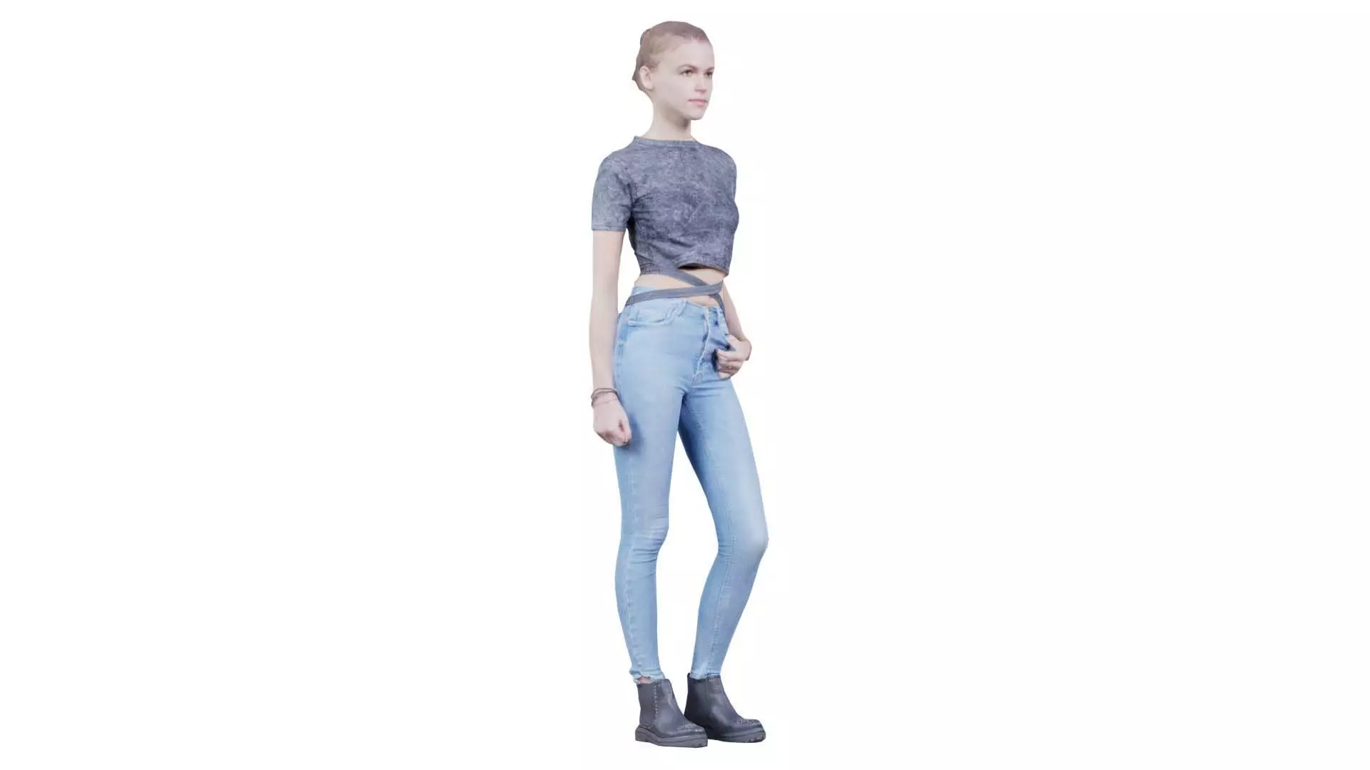 3D scanned model featuring a woman in jeans and a crop top standing. This model, woman in jeans and grey top posing and smiling, has been created using photogrammetry from a real world object.The raw scan data has been cleaned, retopologized and UV-unwrapped using Zbrush. The result is a low poly mesh with baked maps. The .obj and .mtl are configured so that maps will load automatically in the shader (tested in Blender). In addition, a Blender scene is provided with the model and shader already set up for rendering and export. Detailed information below: