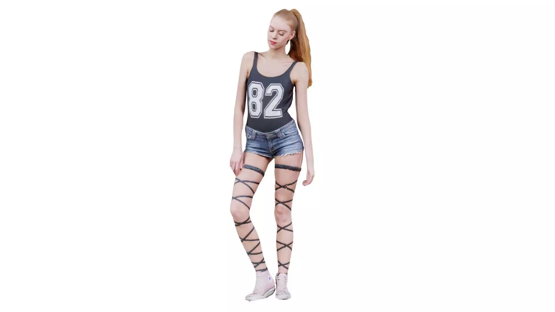 Woman in Jeans Short Strings and 82 Tshirt Posed Looking Down Low-poly 3D model