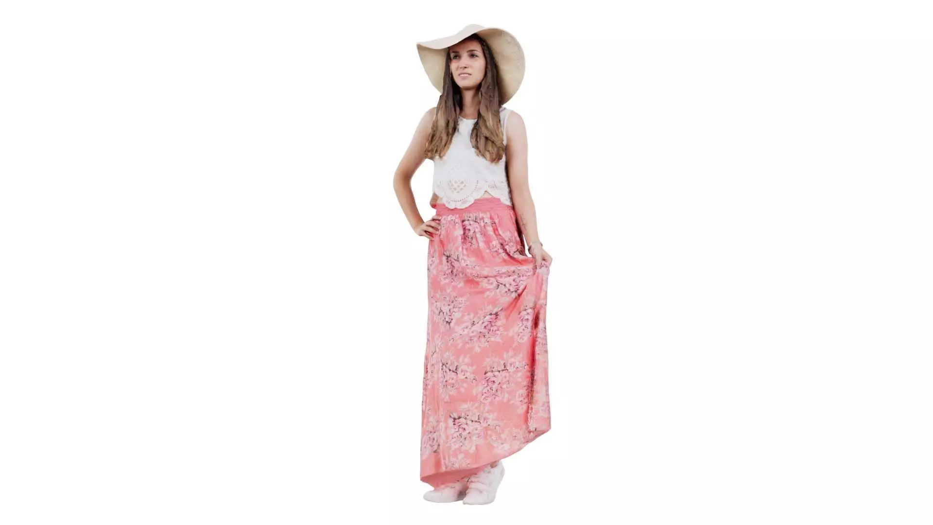 3D scanned model featuring a woman wearing a pink floral skirt and hat. This model, woman in pink dress and hat holding skirt, has been created using photogrammetry from a real world object.The raw scan data has been cleaned, retopologized and UV-unwrapped using Zbrush. The result is a low poly mesh with baked maps. The .obj and .mtl are configured so that maps will load automatically in the shader (tested in Blender). In addition, a Blender scene is provided with the model and shader already set up for rendering and export. Detailed information below: