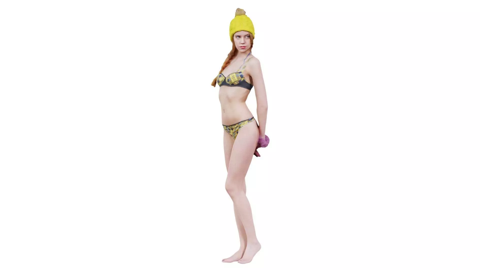 Polygonal Miniatures presents woman in yellow hat purple gloves and bikini posing 1, a model from our 3D scanned catalogue. The model, a woman in a hat and bikini is posing, is obtained by photogrammetry, and scanned using SLR camera's.Processing takes place in Zbrush and Photoshop and the resulting 3D model has unwrapped, non overlapping UV's, and a texture and normal map. Before publishing, we make sure the model has real world scale (meters), correct shader setup and is centered at the origin.Apart from the various file formats, we also offer a Blender file with material and textures set-up, ready for export and rendering. More info can be found below:
