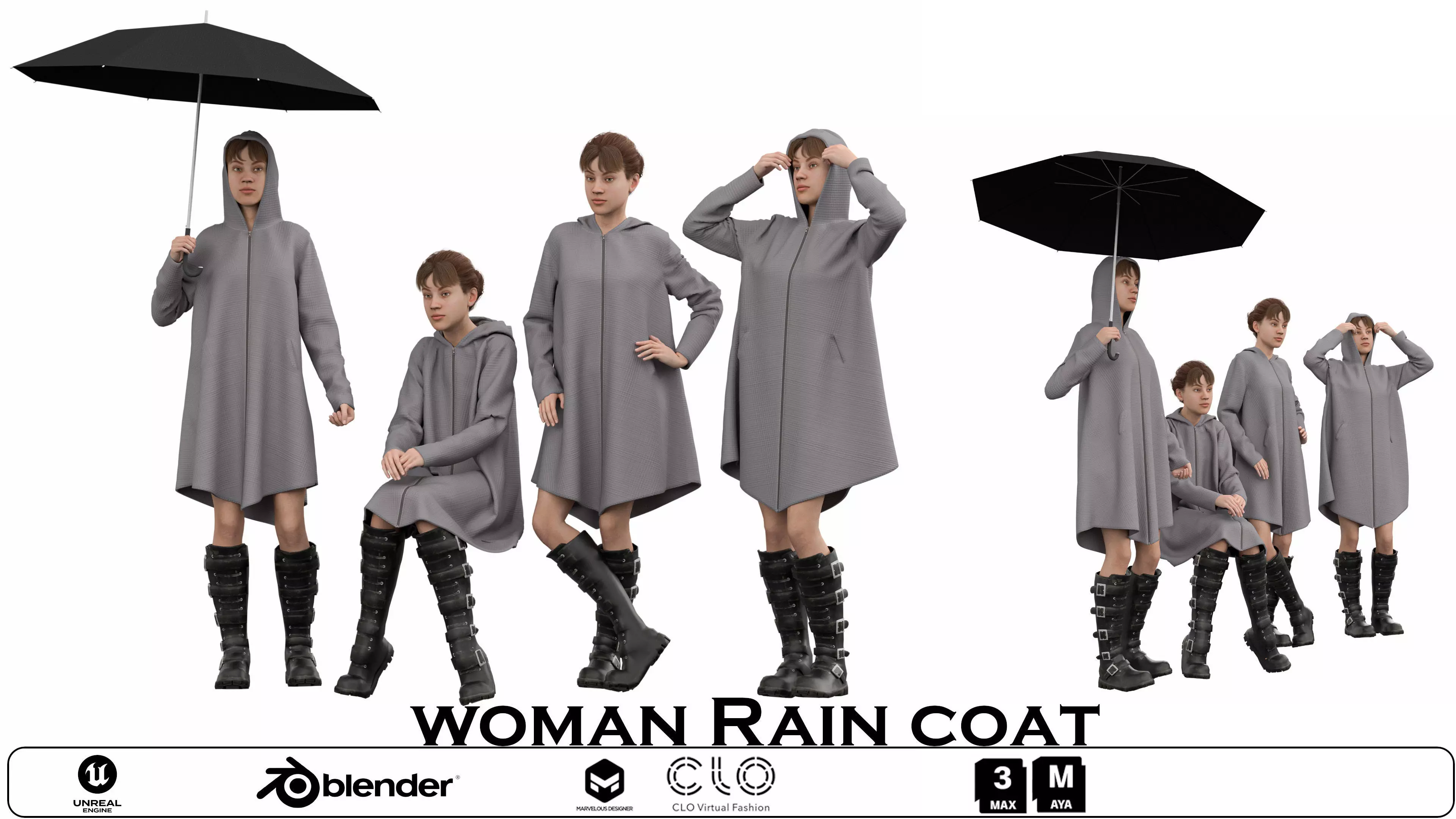 Bring a sense of realism and style to your digital projects with this Woman Rain Coat 3D character set!