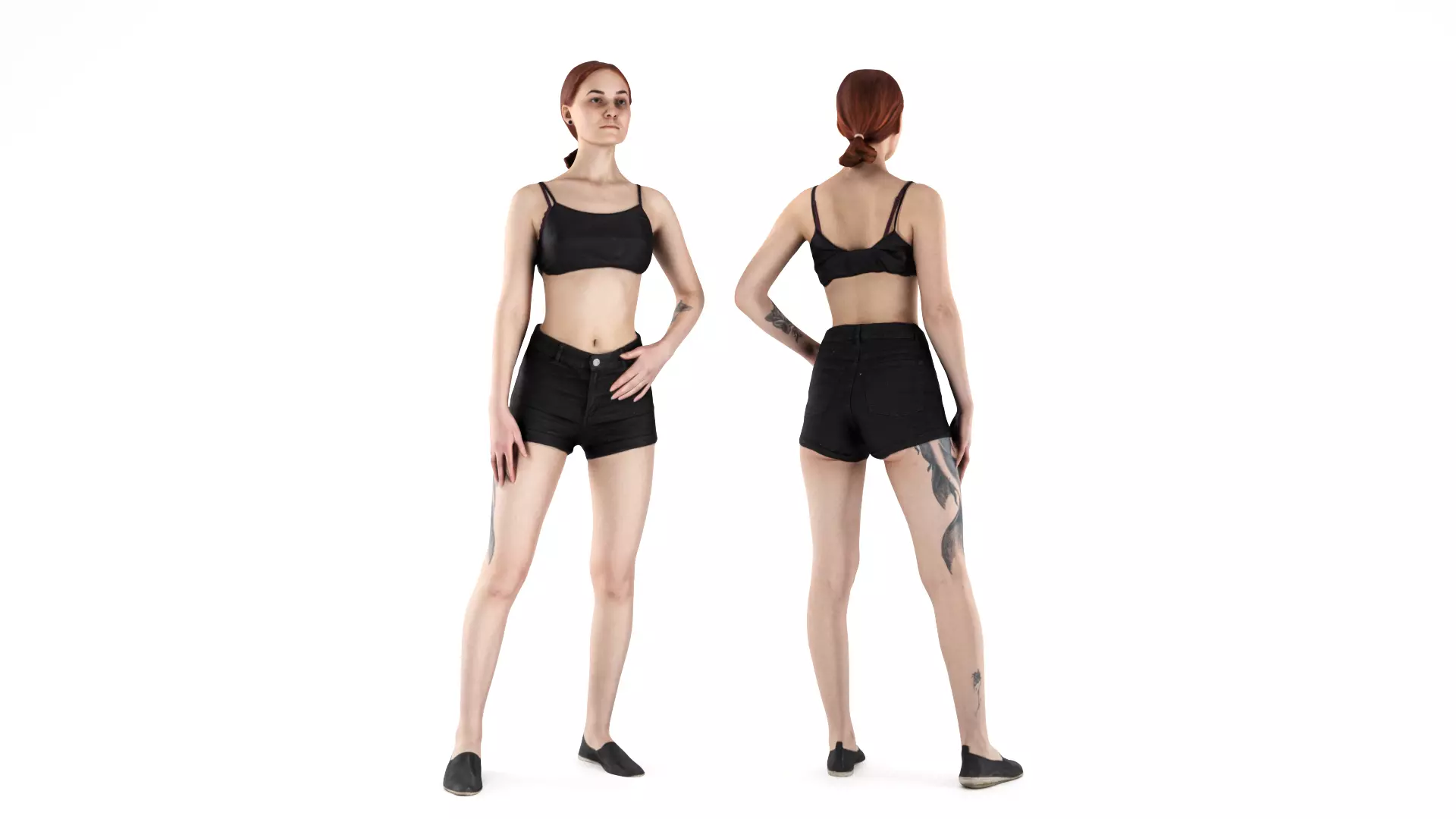 This is a true human size and detailed model of a sporty beautiful young woman of Caucasian appearance. The model is captured in casual pose to be perfectly matching for variety of architectural visualizations, e.g. sport ground, gym, beach, etc.