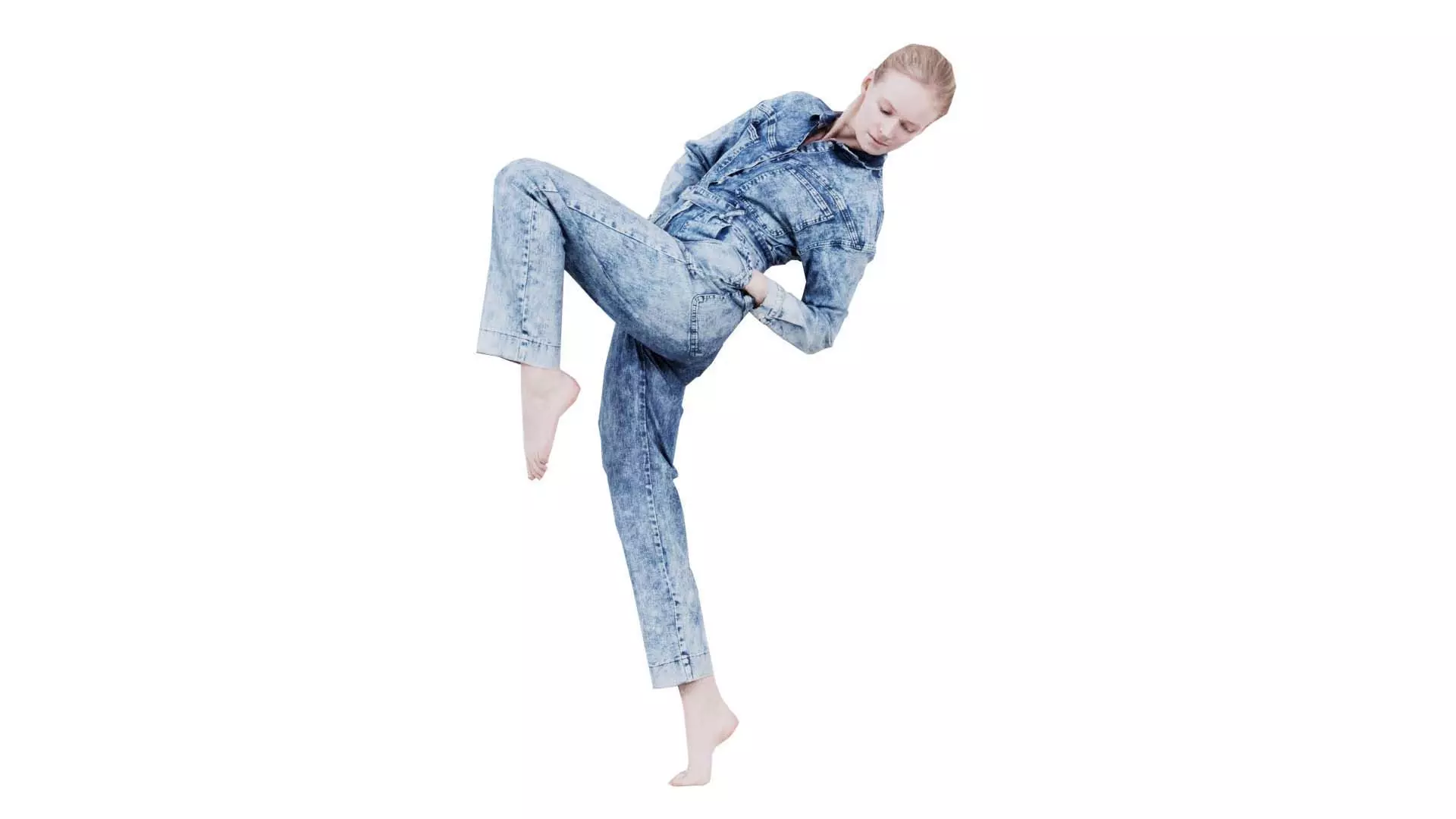 3D scanned model featuring a woman in denim jumpsuit doing a handstand. This model, woman wearing jeans salopet 04, has been created using photogrammetry from a real world object.The raw scan data has been cleaned, retopologized and UV-unwrapped using Zbrush. The result is a low poly mesh with baked maps. The .obj and .mtl are configured so that maps will load automatically in the shader (tested in Blender). In addition, a Blender scene is provided with the model and shader already set up for rendering and export. Detailed information below:
