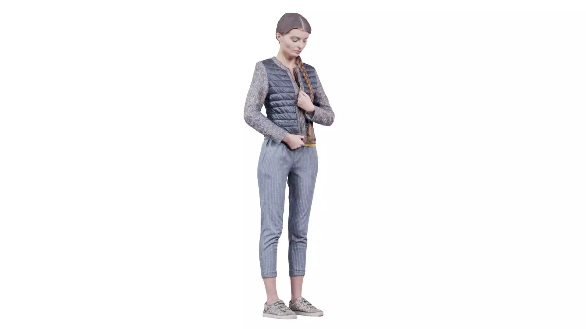 3D scanned model featuring a woman in a vest and pants standing. This model, woman zipping up shiny jacket, has been created using photogrammetry from a real world object.The raw scan data has been cleaned, retopologized and UV-unwrapped using Zbrush. The result is a low poly mesh with baked maps. The .obj and .mtl are configured so that maps will load automatically in the shader (tested in Blender). In addition, a Blender scene is provided with the model and shader already set up for rendering and export. Detailed information below: