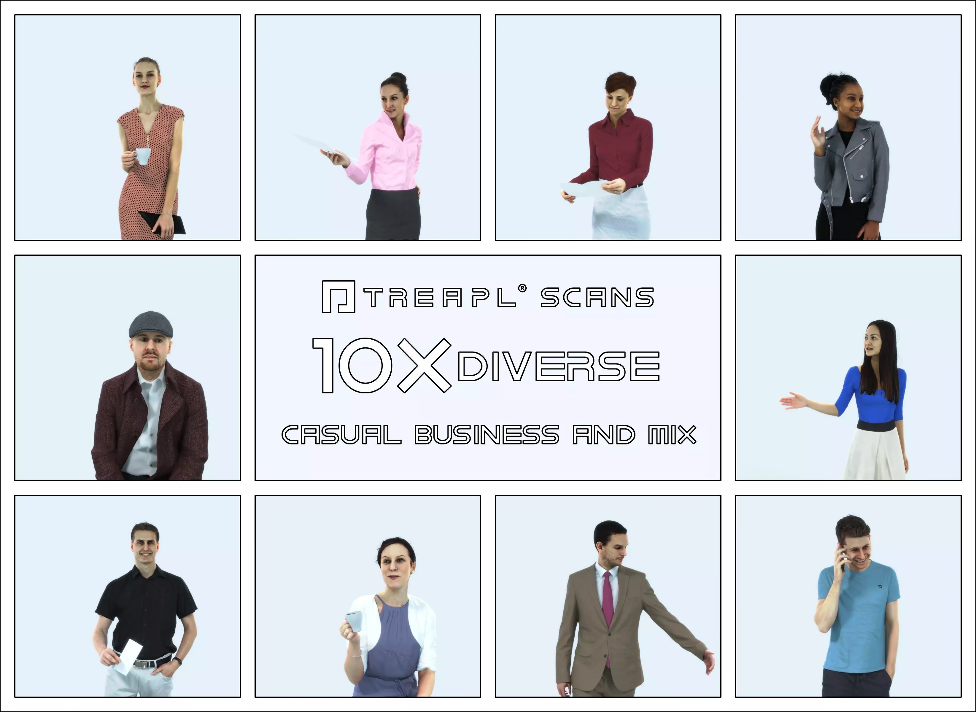 Treapl characters are premium quality scanned 3d people for high-end architecture and advertising - we love presenting both - attractive professional models as well as casual everyday people.
