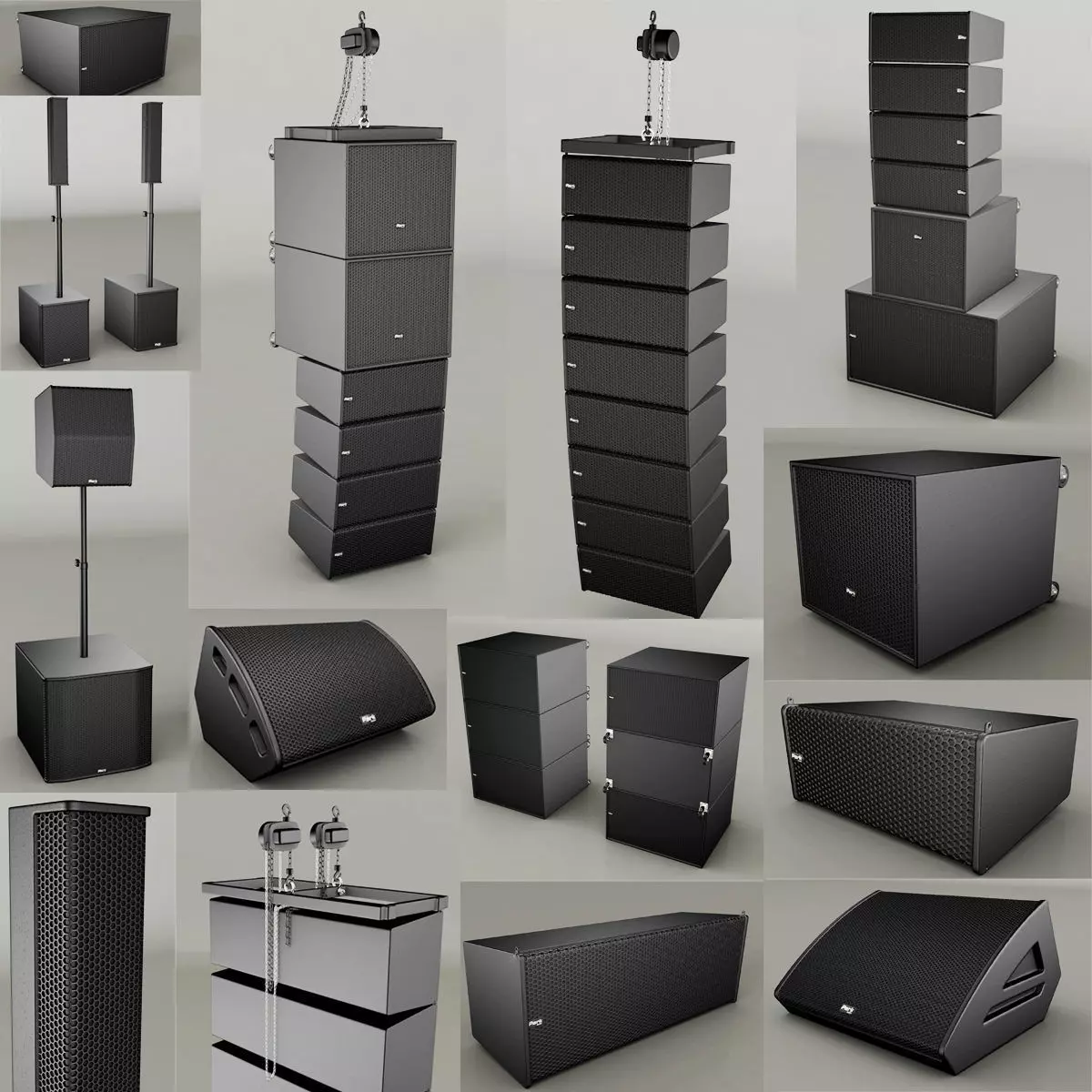 These speakers are suitable for sounding stages, concert venues, conferences, ceremonies and other events of various scales. The collection includes elements of linear arrays, sets of active sound amplification systems, stage monitors, subwoofers and various configurations.For convenience in a scene ready decisions of a configuration of systems, suspension brackets, a groundstack are constructed.Active Spike systems are available in various configurations. Spike and D2 are ideal for events and ceremonies.Linear arrays are presented in two types Line8 and Line12. Used for sounding festivals, concerts.There are two types of subwoofers.For suspension of linear arrays in the model there are special suspension frames and hoists.The model also has two types of stage monitors.The company logo is original, and is a separate object.