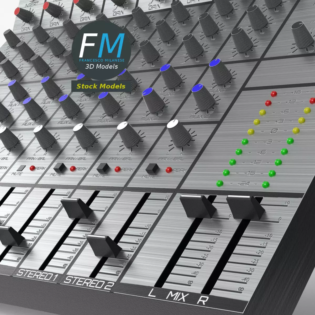 Audio mixer 3D Model, nr. 1 in my collection; 6+2 version: 6 mono + 2 stereo inputs. 77 individual objects (you can rotate or move each knob or slider), sharing the same OVERLAPPING UV Layout map, Material and PBR Textures set. Production-ready 3D Model, with PBR materials, textures, overlapping UV Layout map provided in the package.Quads only geometries (no tris/ngons).Easily customizable: UV unwrapped geometries, so you can create new Textures (or modify the existing ones) using the UV Layout maps provided in the package (as png with alpha).Each Object, Material or Texture provided in the package has a unique, meaningful name.Made in Blender 3.0 with a Cycles PBR shader with textures included (principled and Eevee compatible), then exported to OBJ and FBX; materials and textures made in Substance Painter, exported for PBR, V-Ray, Unity, Unreal.PROMO IMAGES: the first image has been rendered in Cycles for Blender 3.0; in particular, you can find 11+ promo images in this description: