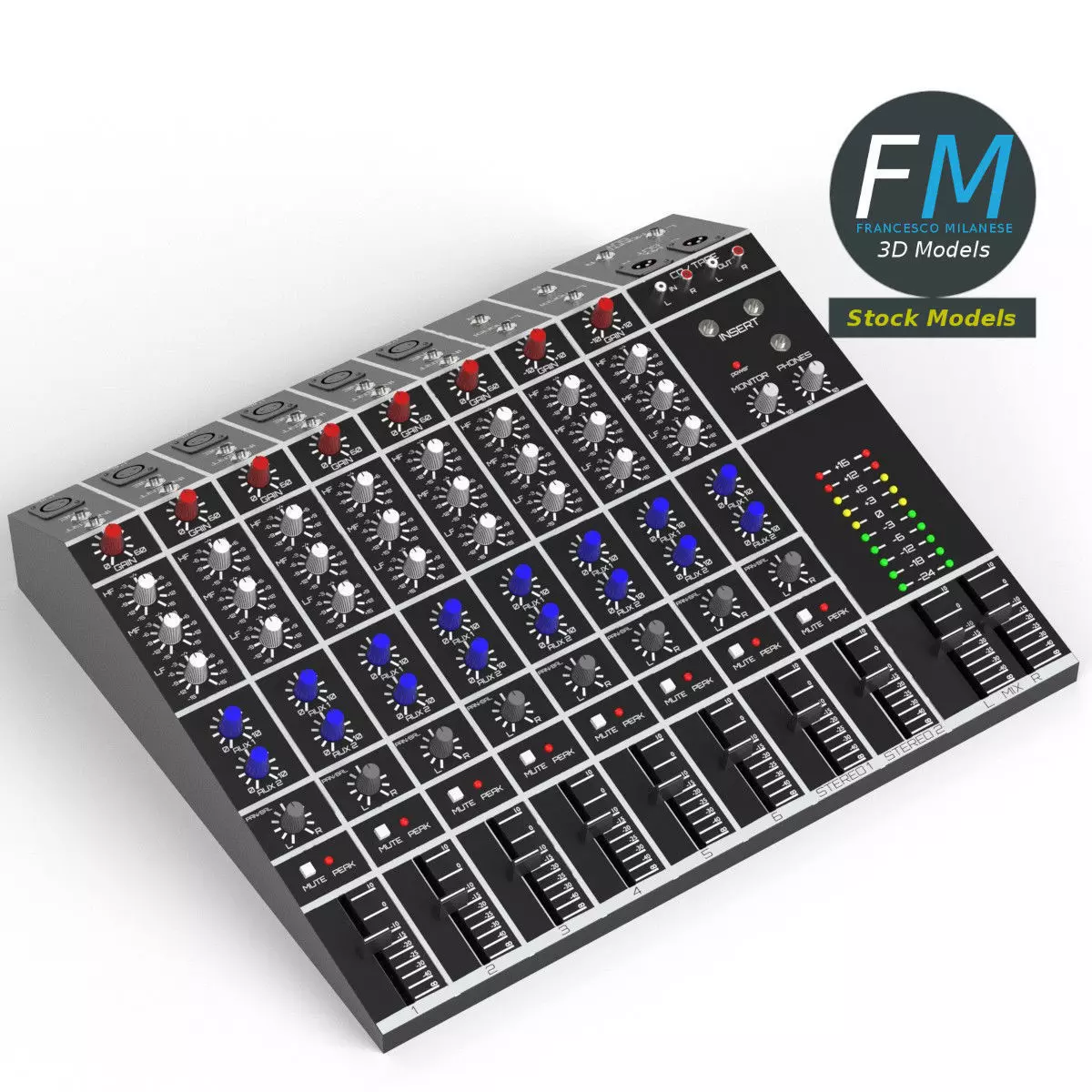 Audio mixer 3D Model, nr. 2 in my collection; 6+2 version: 6 mono + 2 stereo inputs. 77 individual objects (you can rotate or move each knob or slider), sharing the same OVERLAPPING UV Layout map, Material and PBR Textures set. Production-ready 3D Model, with PBR materials, textures, non overlapping UV Layout map provided in the package.Quads only geometries (no tris/ngons).Easily customizable: UV unwrapped geometries, so you can create new Textures (or modify the existing ones) using the UV Layout maps provided in the package (as png with alpha).Each Object, Material or Texture provided in the package has a unique, meaningful name.Made in Blender 3.0 with a Cycles PBR shader with textures included (principled and Eevee compatible), then exported to OBJ and FBX; materials and textures made in Substance Painter, exported for PBR, V-Ray, Unity, Unreal.PROMO IMAGES: the first image has been rendered in Cycles for Blender 3.0; in particular, you can find 11+ promo images in this description:
