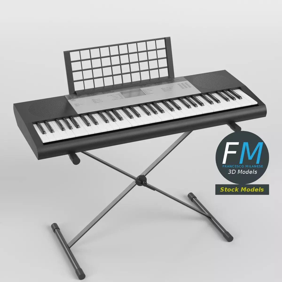 Realistic Electronic Piano Keyboard with integrated speakers, music rest, and X-frame support, ideal as a detailed 3D Model for music scenes, stage setups, studio environments, and educational renders. ---- 3 individual objects (stand, keyboard, music stand), sharing 3 Materials (stands; keyboard header and buttons; keyboard chassis and keys), each Material with its own non overlapping UV Layout Map and PBR Textures set. Production-ready 3D Model with non overlapping UV Layout map provided in the package. PBR Materials and Textures (Metallic Workflow: Base Color, Metallic, Roughness, Normal) embedded in the Blend, FBX, and GLB files.Easily customizable: UV unwrapped geometries; UV Layout maps provided in the package as png with alpha images.Quads-only geometry.Made with Blender 5 with Cycles Principled BSDF (PBR, Metallic Workflow) Material, then exported to other formats (OBJ, FBX, GLB; FBX and GLB have embedded textures).Promo images: some renderings made with Cycles for Blender, plus Wireframes and Blender screenshots (Object Mode, Edit Mode with UVs).Formats included: FBX with embedded PBR Textures (Metallic Workflow: Base Color, Metallic, Roughness, Normal), GLB with embedded PBR Textures (Metallic Workflow: Base Color, Metallic, Roughness, Normal), OBJ; scenes: BLEND (with Cycles Principled (PBR) Materials); other: 16-bit PNGs with Alpha.3 Objects (meshes), 3 PBR Materials, UV unwrapped (non overlapping UV Layout map provided in the package).UV Layout maps and Image Textures resolutions: 2048x2048.Polygonal, QUADS-ONLY, 42365 vertices, 41681 quad faces (83362 tris).Real world dimensions; scene scale units: METERS in Blender 5 (that is: Metric with 1.00 scale).Uniform scale object (scale applied in Blender 5).PBR Textues included: in a zipped folder, you'll find the PBR Textures set (as 16-bit PNGs with Alpha).IMPORTANT --- Main renderings made with Blender 5 + Cycles using an HDR Environment Texture Image which is NOT provided in the package!
