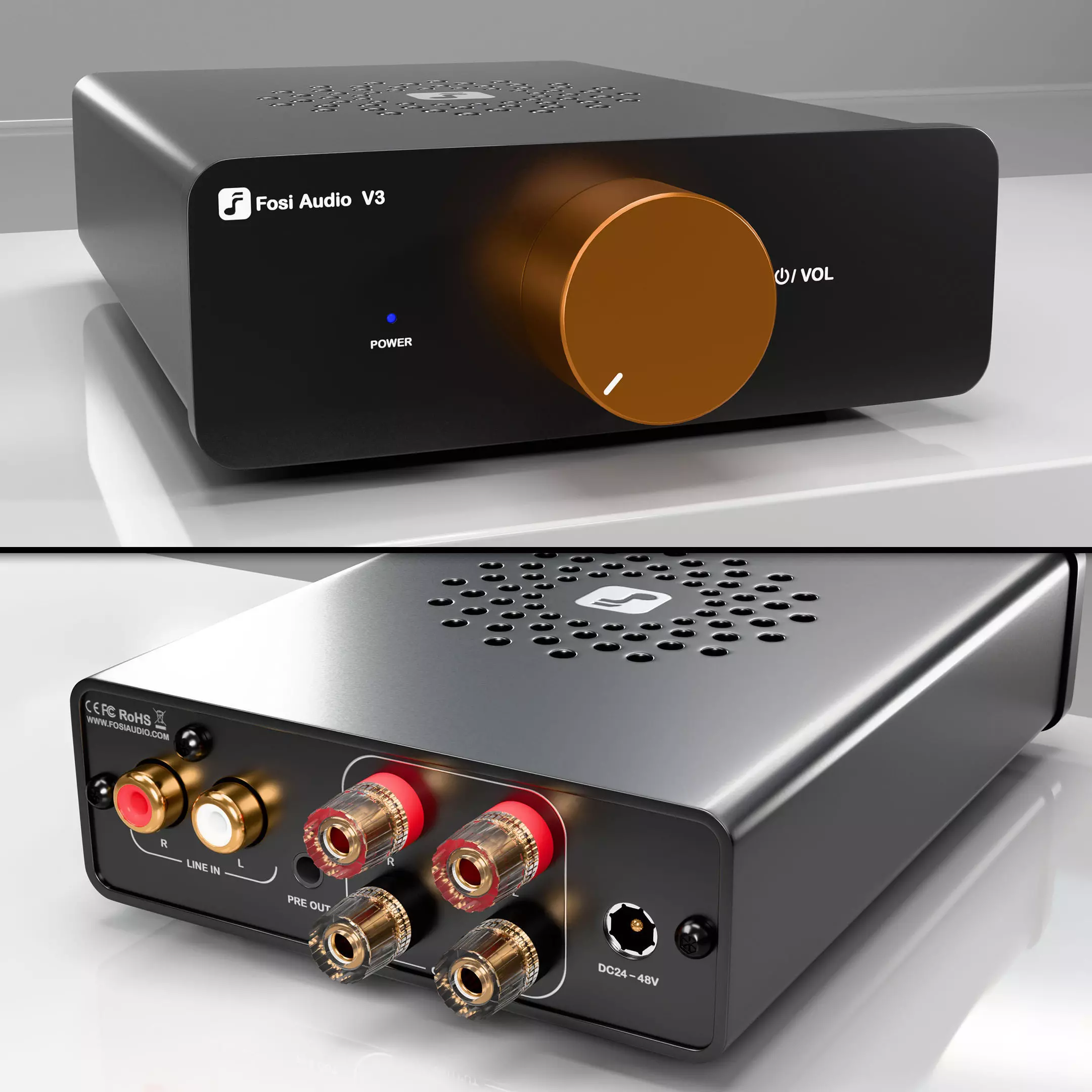 3D model of the Fosi Audio V3 amplifier suitable for rendering. This is a subdivision ready high poly model consisting of separate meshes for the front panel, main body and various connectors. 4K PBR materials are made for each mesh (basecolor, metalness, roughness, normal, transmission, and emissive), two color variations for the front panel volume button (orange and black). Preview images are rendered using Blender 4.2 Cycles. Thanks for viewing my models!