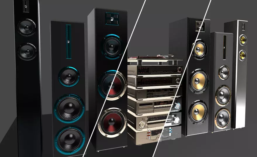By default the color set of all units is glossy black with some aqua parts but you can change it any way you need.You can change glossiness and metalness of parts, show or hide wood texture on speakers and so on.