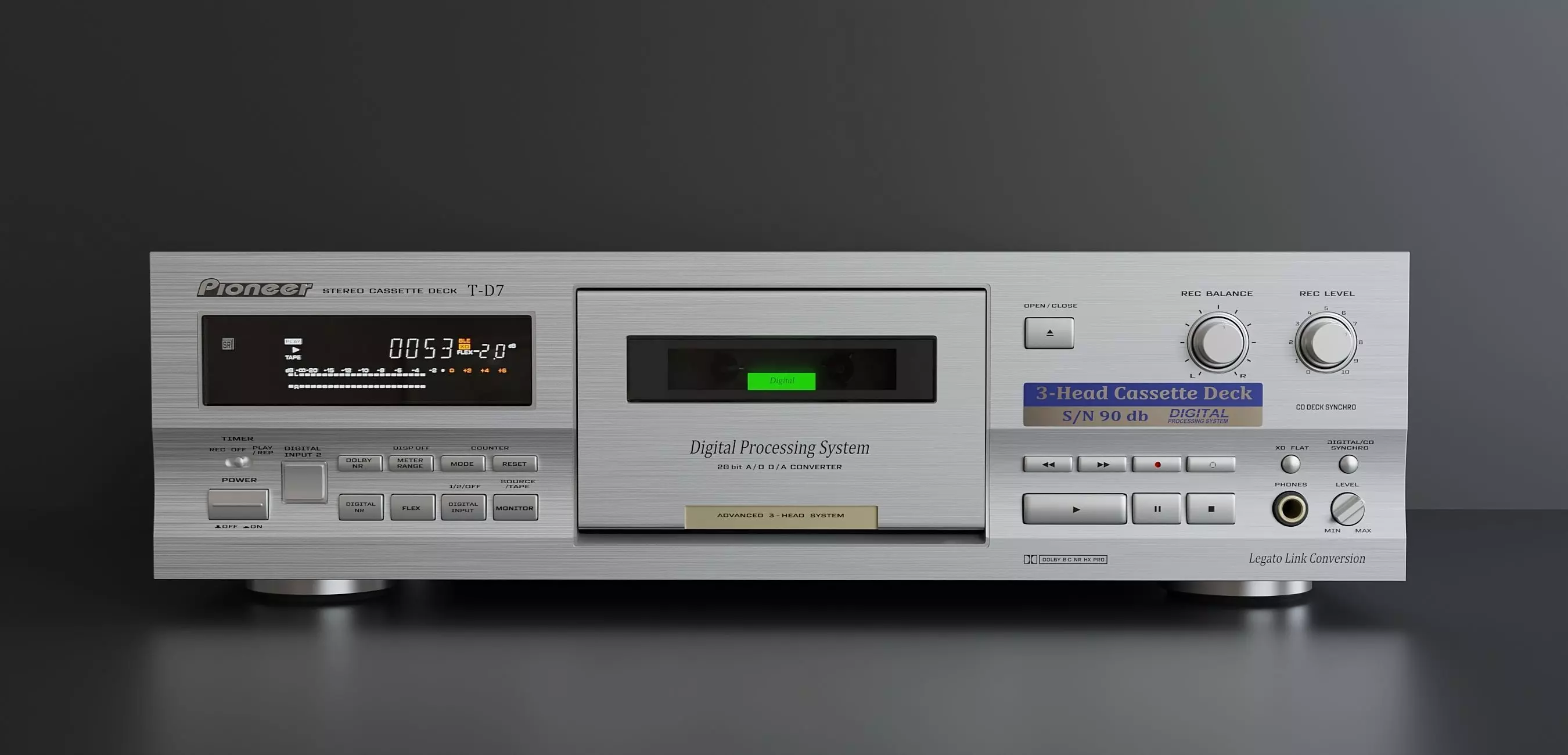 Pioneer T-D7. A three head cassette deck equipped with a digital processing system.All model parts are combined into one object. The texture of the VU meter is packed into a zip archive. All materials are native blende Only procedural textures were used (blender)