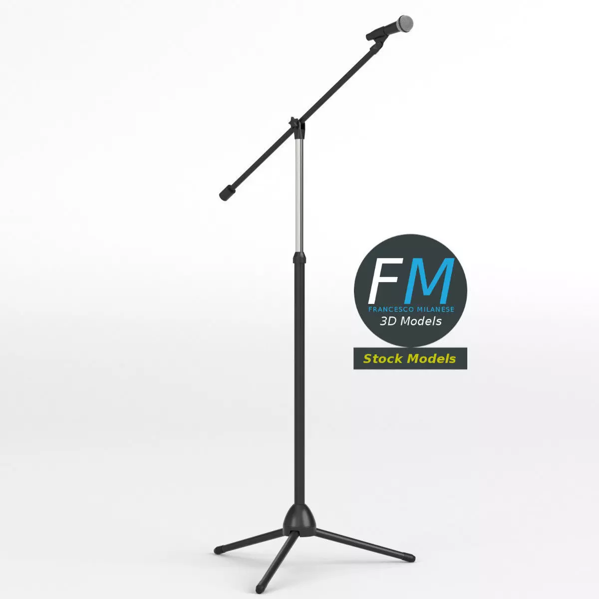 Microphone on boom stand 3D Model. 5 individual objects (base, extension, boom stick, rotating part, microphone; so, you can easily rotate the sticks or even remove the microphone --- see preview images), sharing the same non overlapping UV Layout map, Material and PBR Textures set. Production-ready 3D Model, with PBR materials, textures, non overlapping UV Layout map provided in the package.Quads only geometries (no tris/ngons).Easily customizable: UV unwrapped geometries, so you can create new Textures (or modify the existing ones) using the UV Layout maps provided in the package (as png with alpha).Each Object, Material or Texture provided in the package has a unique, meaningful name.Made in Blender with a Cycles PBR shader with textures included (principled and Eevee compatible), then exported to OBJ and FBX; materials and textures made in Substance Painter, exported for PBR, V-Ray, Unity, Unreal.PROMO IMAGES: the first image has been rendered in Cycles for Blender; in particular, you can find 11+ promo images in this description: