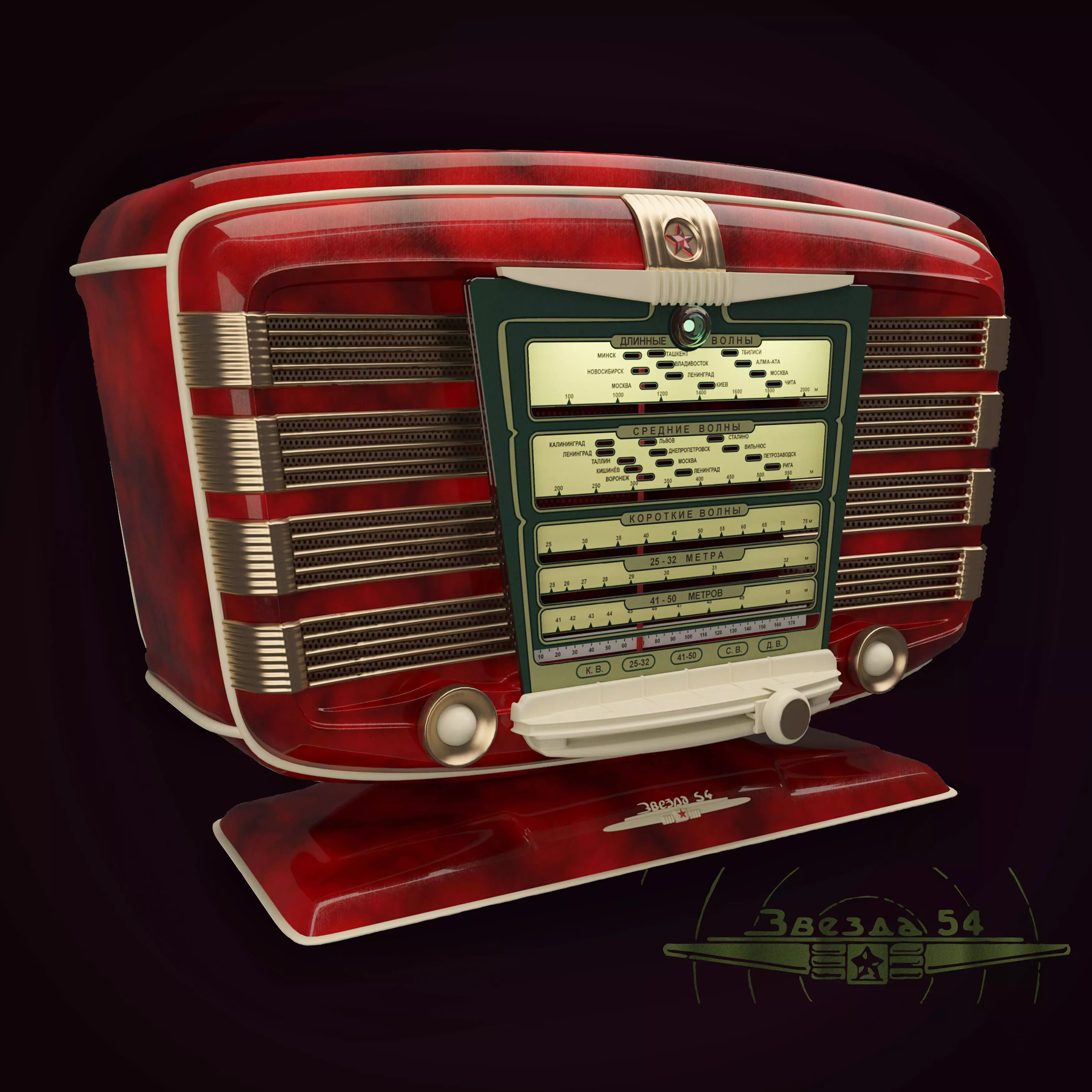 Radio network lamp Zvezda-54 from the II quarter of 1954 The radio receiver network lamp Zvezda-54 from the II quarter of 1954 was produced by the Kharkov plant Kommunar and the Moscow plant Mospribor. The release of the radio was quite a significant event of the mid-fifties in the USSR. The receiver did not fit into the usual line of models of dull and gray receivers and the radiometer in wooden cases, like twins similar to each other and not changing in design for years. The mass media mainly in newspaper and magazine editions of those years very effectively described the appearance of the Zvezda-54 radio receiver as a huge breakthrough in the design of the design, as the latest fad, which gave people hope for the onset of a new, bright life. In fact, everything was much simpler and more prosaic. Radio Star-54 in its external design is a complete copy of the French radio Excelsior-52 of the release of 1952. It is not precisely established how the French receiver got into the IRPA. According to some of it, as a gift brought diplomats who visited France in 1952 on the independence of Austria. According to another version, the radio receiver was specially purchased for copying and release by order of senior management. Another touch related to the release of a radio receiver: In the post-war years, the government of the CCCR made a decision providing for the production by the defense enterprises of the USSR, together with special products, of consumer goods as well. In accordance with this, since 1952, the All-Union Research Institute of Broadcasting Reception and Acoustics named after AS Popov, abbreviated IRPA, together with the Kommunar plant (Kharkov, Ukraine) began the development and preparation of the conveyor for mass production radio Star-54. In 1954, the production of the receiver in parallel was transferred to the plant Mospribor (former bicycle factory). In the third quarter of 1954, the radio was upgraded. The modernization touched the chassis of the model, which became vertical, to facilitate technological processes and expand the color gamut of the case (red and green, there were no other colors). Both versions, modernized and ordinary in cases of two colors, produced both factories in parallel, but many more receivers in the red case were produced. In general, and the model was produced from 1954 to 1959, two plants produced 674.000 receivers '' Star-54 ''. Often confuses the ISH logo on the back cover or in the instructions of the device.