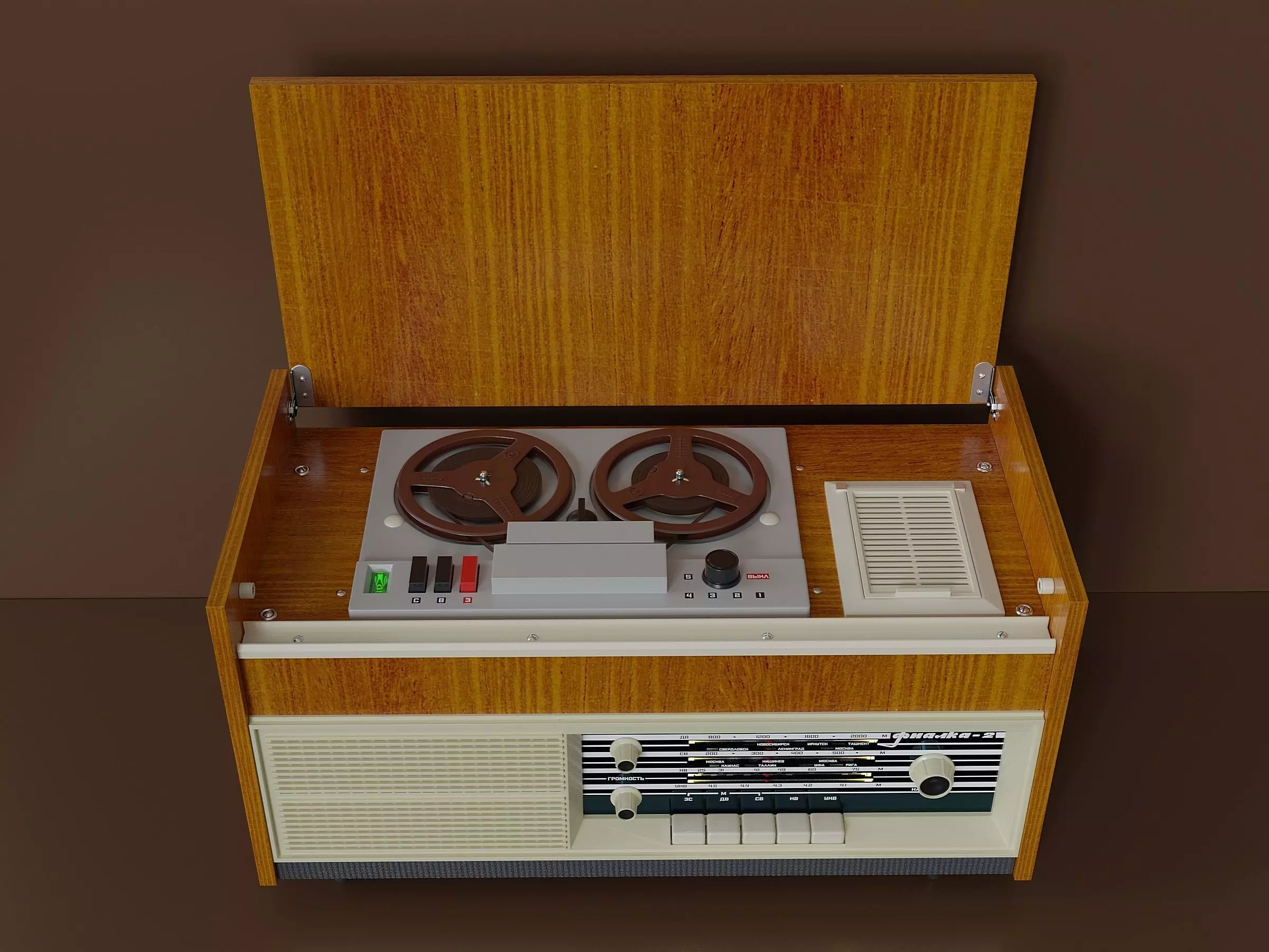 Rare tube radio - tape recorder.Stationary device in a wooden case. The model consists of three objects: The main frame, a wooden cover and a plastic one (internal, from a container for a microphone. There is no microphone in the kit. Soon I will put it up for sale as a separate model) Both covers are tied to the main body (Only for a file in the blend format. In other formats, these are unrelated objects) The texture (wood) is packed in a zip archive.