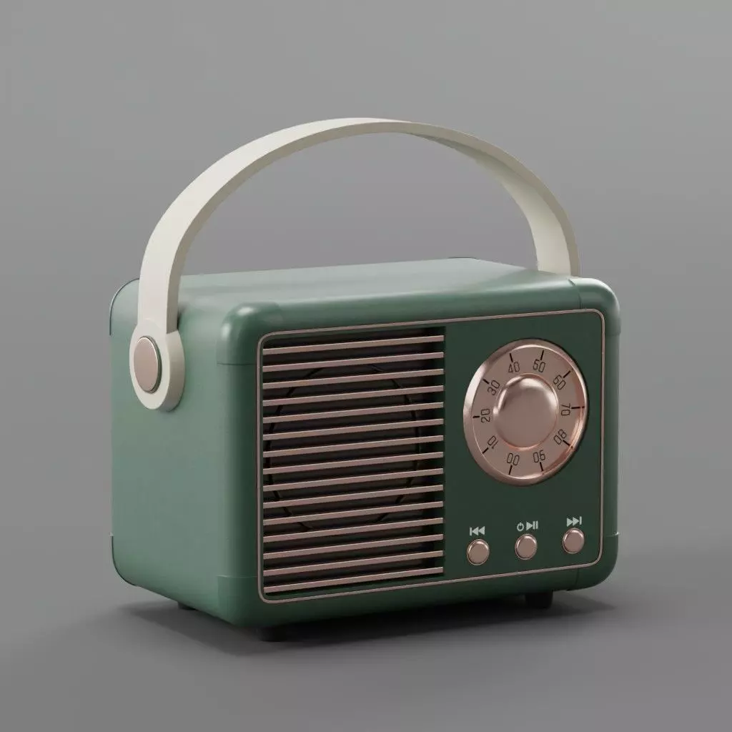 This is a retro-style portable radio with a green body and a white handle.It features a large tuning knob, front speaker grill, and control buttons.Perfect for vintage decor, music lovers, or as a collectible display piece.JPEG format4K texture