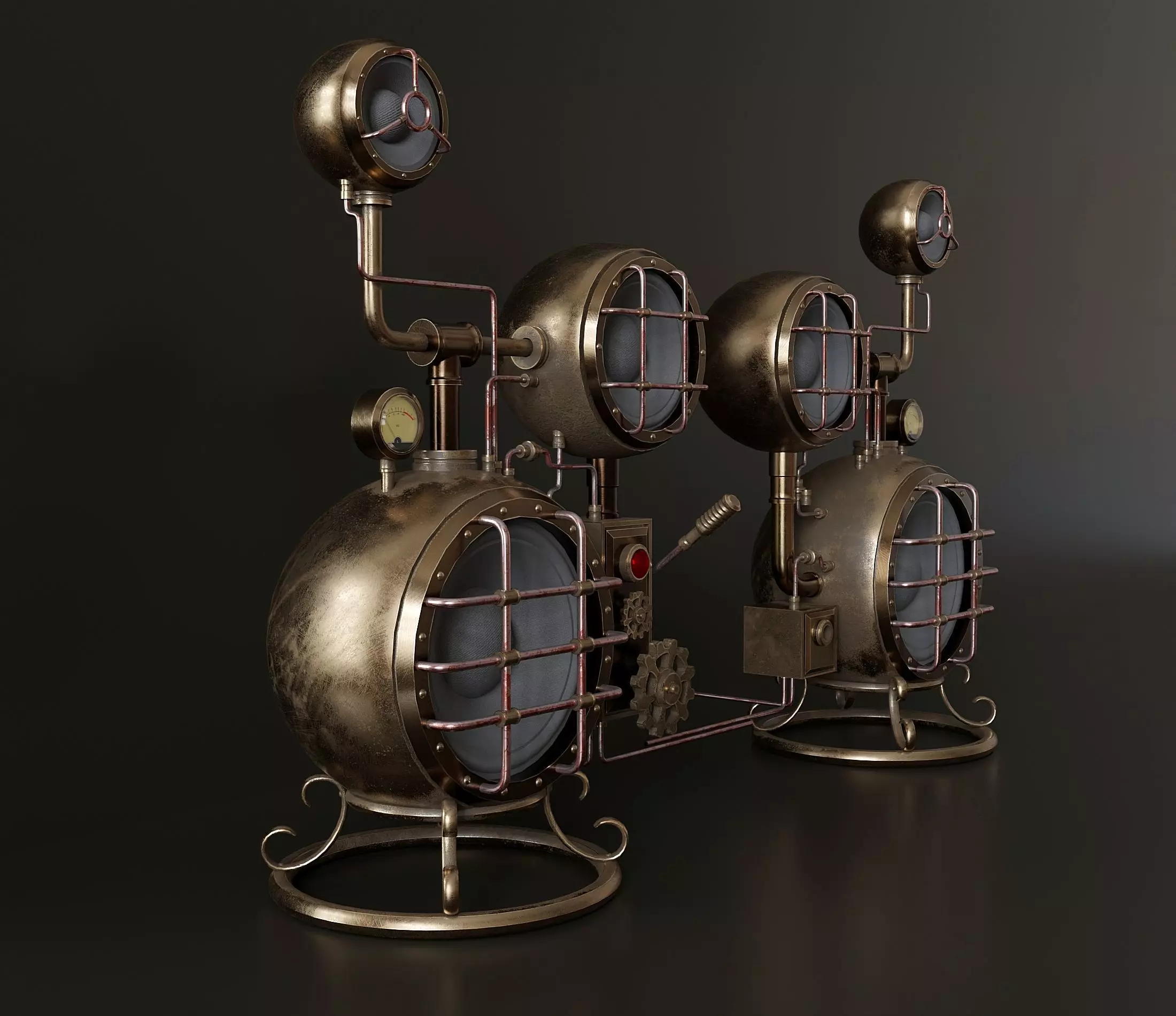 Steampunk computer speakers. The model consists of two objects - left and right speaker. Textures (resolution 4096x4096) were created in the substance painter program and packed into a zip archive. The material of the glass parts is native blender. The VU meter texture is also in the zip archive.