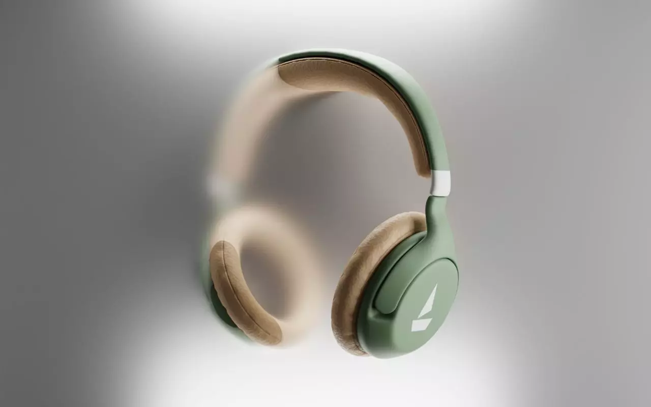 The headphones boast a sleek, minimalistic design with a soft green exterior.The ear cups and headband padding are upholstered in a cozy beige material, ensuring a realistic and comfortable look.Materials & Textures: